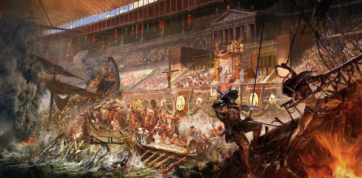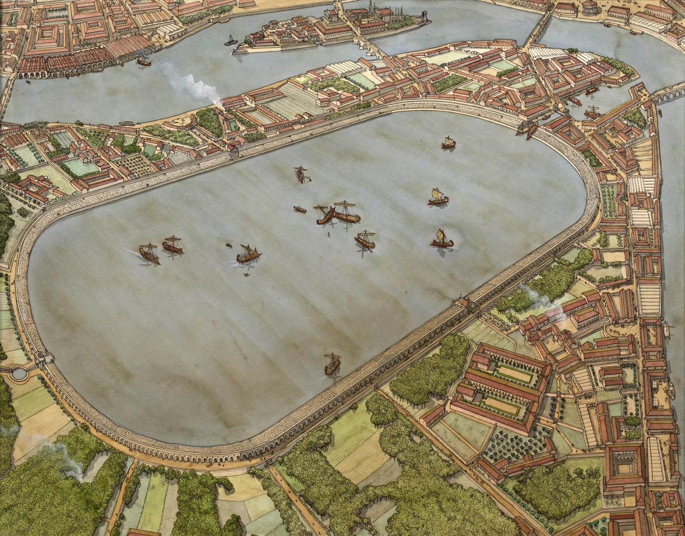 자세하게 본 모습. 이 광대한 분지에서 로마 전함들이 피비린내 나는 전투를 벌였다. 줄지어 늘어선 모든 좌석이 군중을 환영했다. 중앙에는 계류를 위한 긴 부두가 있다.