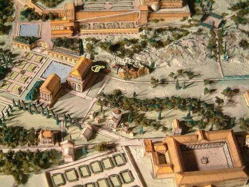 포르투엔시스 가도에 있는 정원의 남쪽 부분에는 템플룸 포르티스 포르투나이(사진 중앙)가 있었다. 이 아름다운 행운의 신전은 카이사르가 죽은 후에 지어졌을 수도 있다. 도시 성벽 바깥의 로마 도로에는 무덤이 늘어서 있었다. 포르투엔시스 가도와 사진 하단의 캄파나 가도에 줄지어 있는 다양한 크기의 무덤을 볼 수 있다.