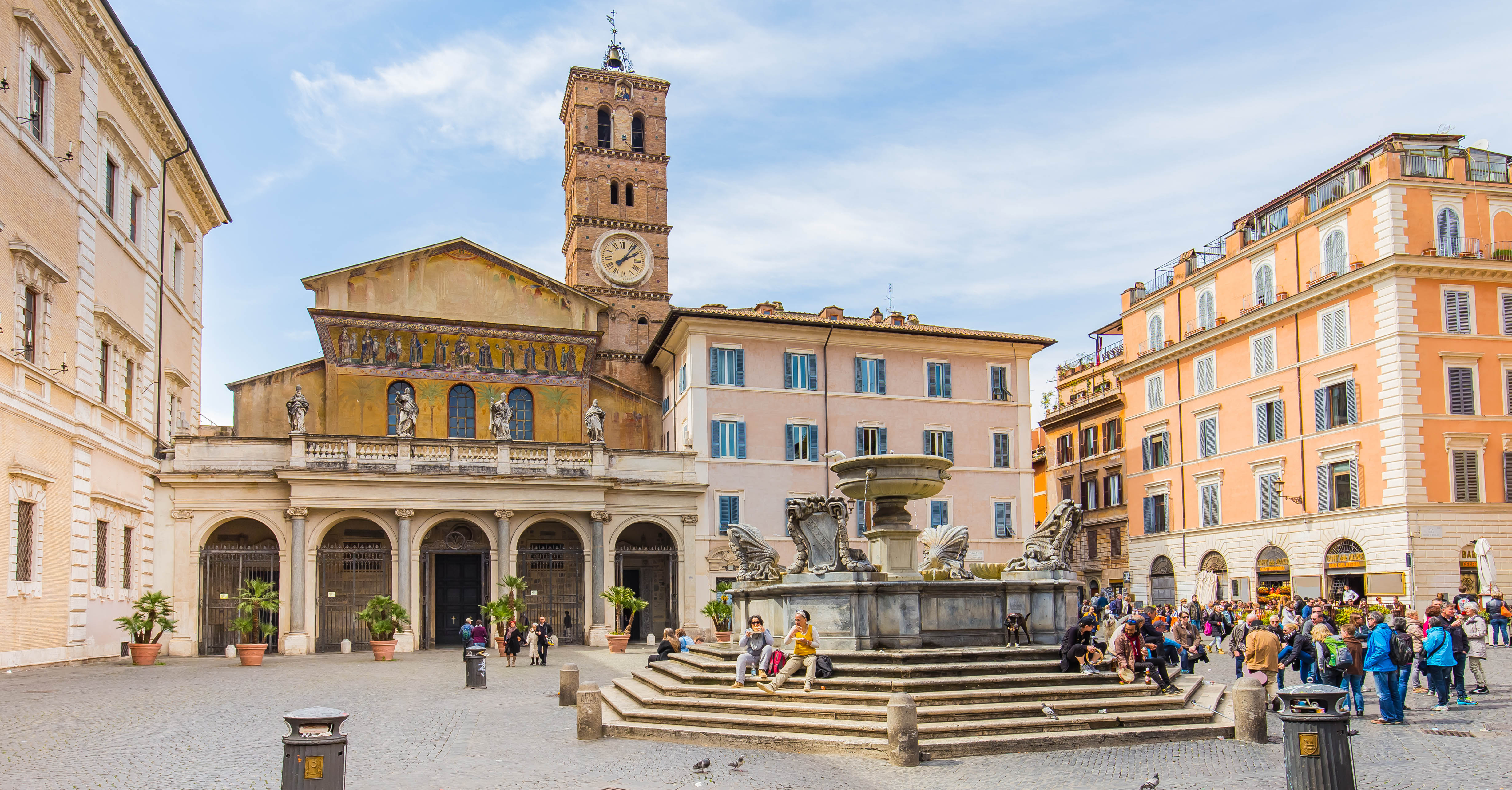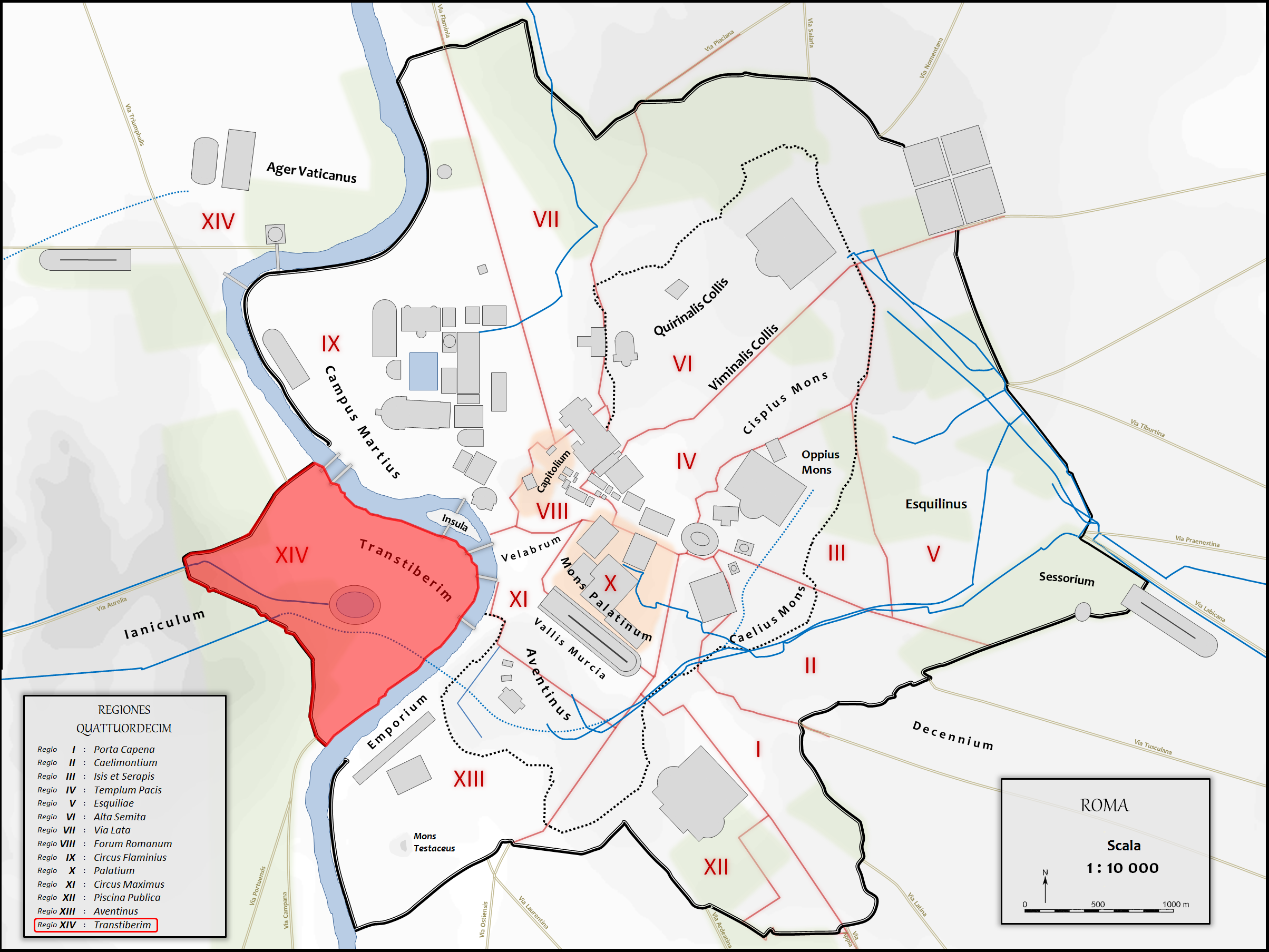 트라스테베레(Regio XIV)의 전경. 구역은 테베레 섬 옆의 테베레 강을 따라 형태를 이루었다. 이곳은 장인과 소규모 상점 주인들이 어우러진 인기 지역이라는 평판을 얻었다. 트라스테베레의 주된 매력은 의심할 여지없이 아우구스투스의 나우마키아였다.
