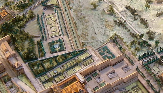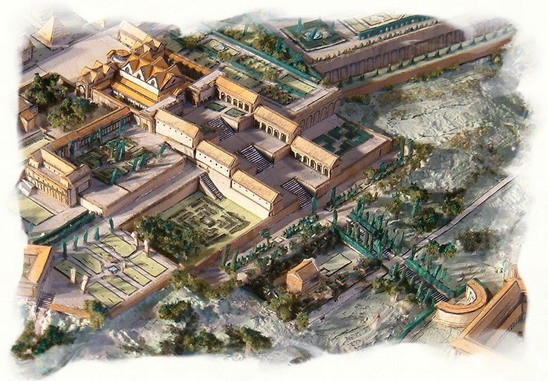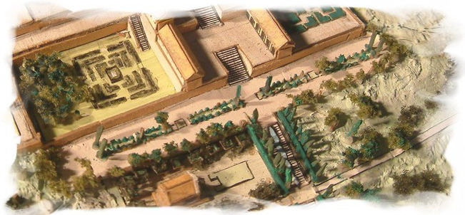 자세하게 본 달리기 트랙과 스피나. 테라스에 세워진 사진 하단의 작은 사원이 전체를 완성했다. 님파이움으로 이어지는 계단 중간에는 계단식 분수대가 있어 방문객을 상쾌하게 했다.