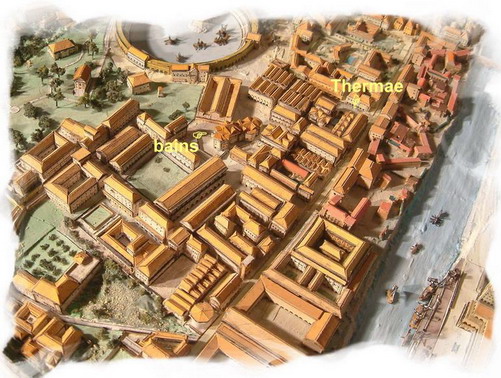 창고 사이에 만들어진 대중목욕탕. 조금 더 아래쪽에 포르투엔시스 가도 근처에 아마도 황제를 기리기 위해 세워진 아우렐리아누스 목욕탕이 있었다.