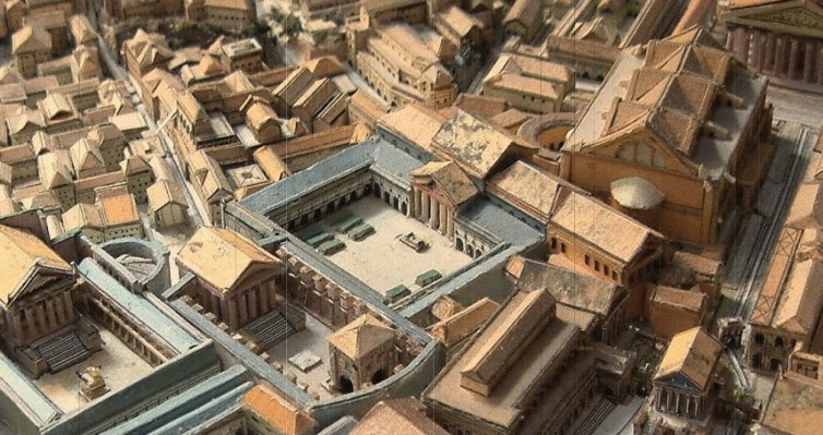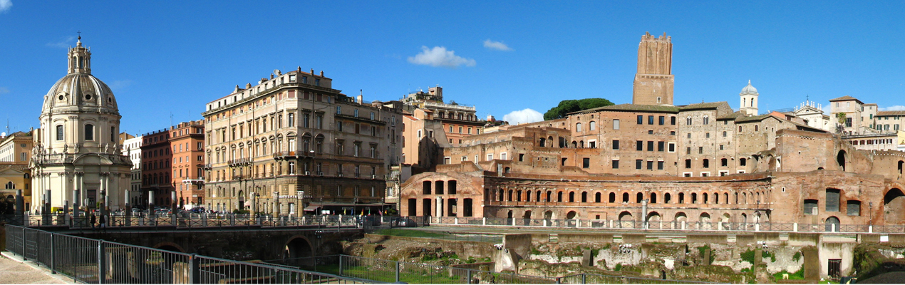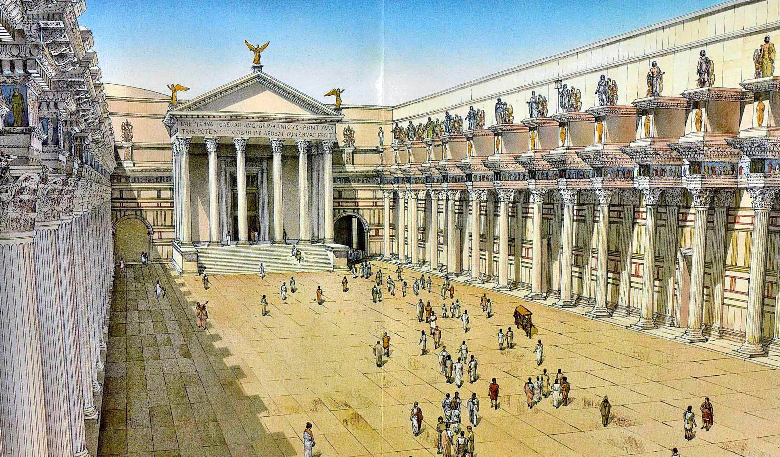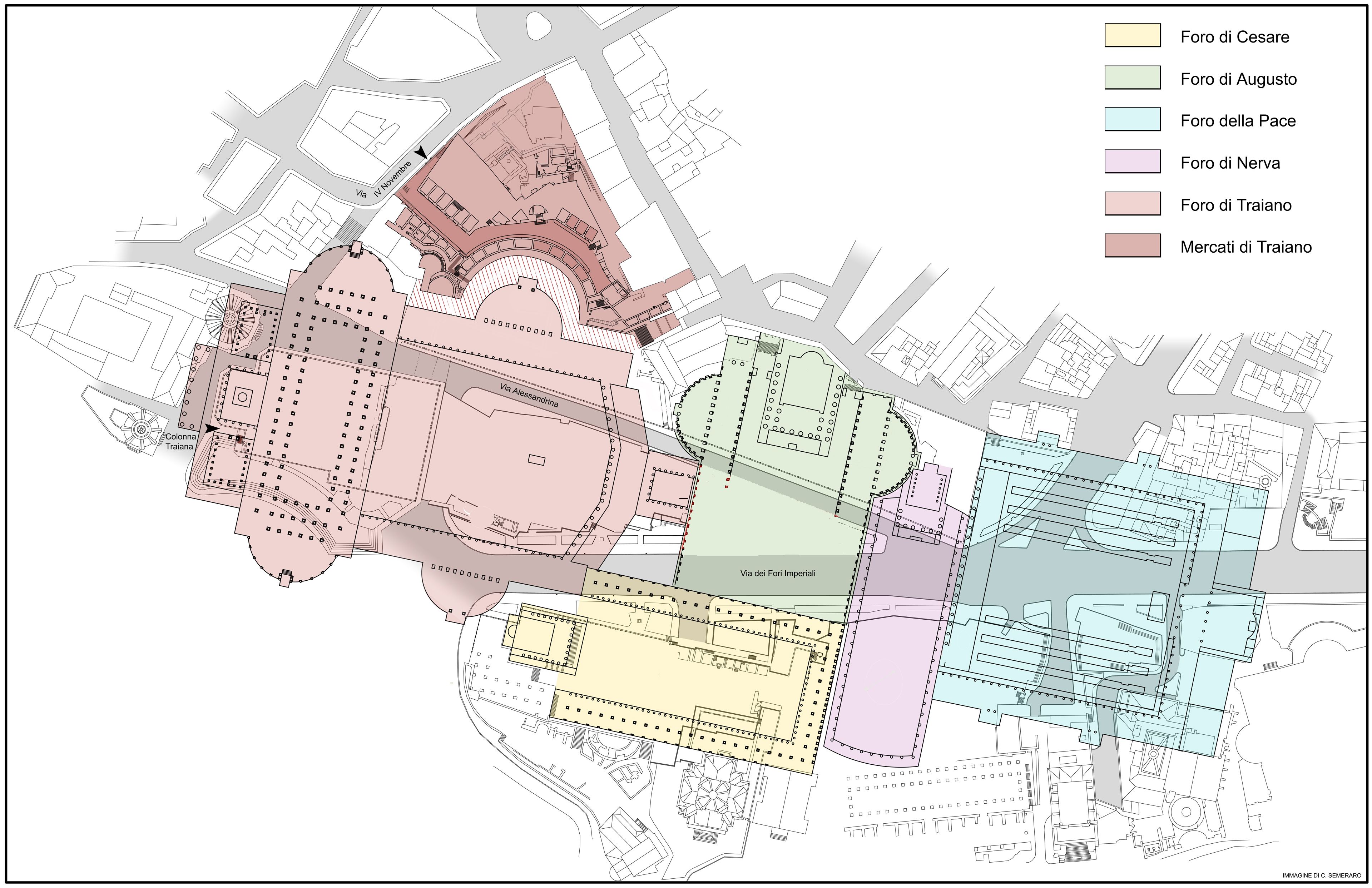 황제 포룸의 전경(사진 중앙의 파란색). 오른쪽에는 포로 로마노와 팔라티노가 있고 왼쪽에는 퀴리날레 언덕이 있다. 오래된 포로 로마노는 고대 로마의 공공 및 재판 업무의 중심지였다. 반대로, 로마와 제국의 발전으로 인해 곧 재판의 모든 요구나 민중의 모임에 비해 너무 비좁아졌다. 따라서 황제들은 주랑 현관, 신전, 도서관, 그리고 바실리카로 구성된 주목할만한 복합단지를 형성하는 소위 황제 포룸이라는 포룸을 연속적으로 건설했다. 게다가, 황제들은 그것을 위신의 문제로 여겼다. 그럼에도 불구하고 황제 포룸은 로마의 중심지로 항상 남아있던 오래된 포룸을 결코 능가하지 못했다.