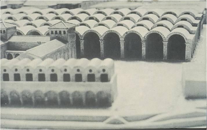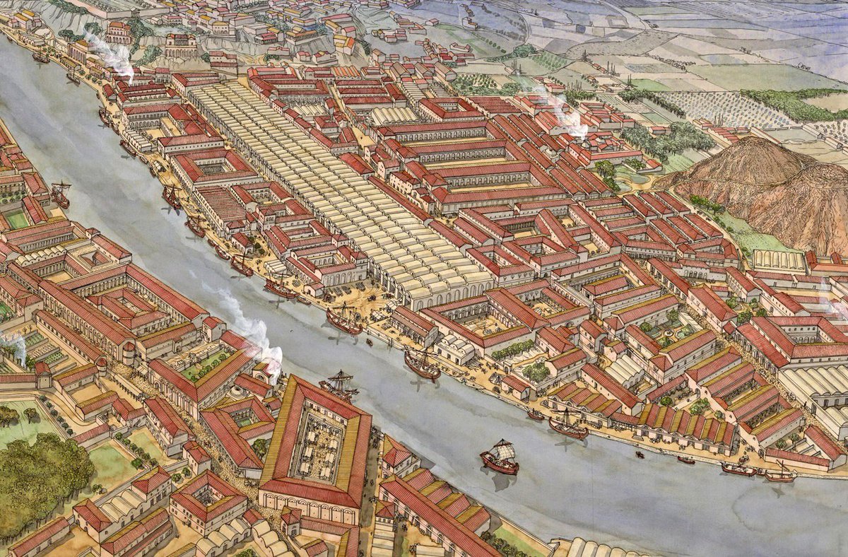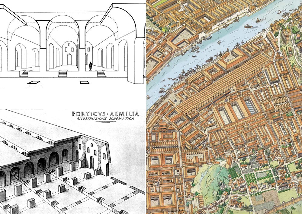 트라스테베레(트라스-테베레는 "테베레 강 너머에"라는 의미)에서 본 엠포리움. 아이밀리우스 포르티코의 길이를 알 수 있다. 몇몇 다른 창고들이 주변에 지어졌으며 배경에는 유명한 갈바 창고가 있다.