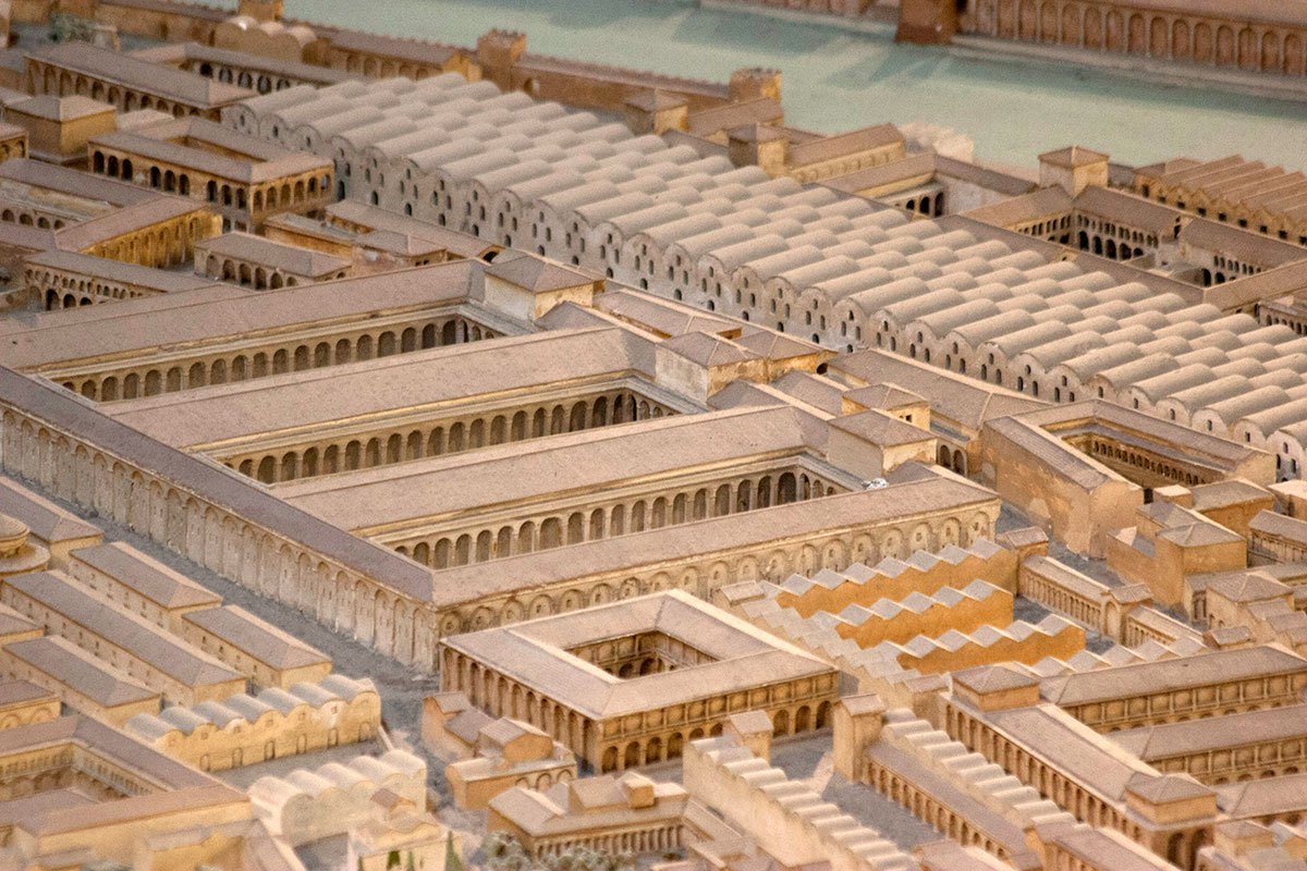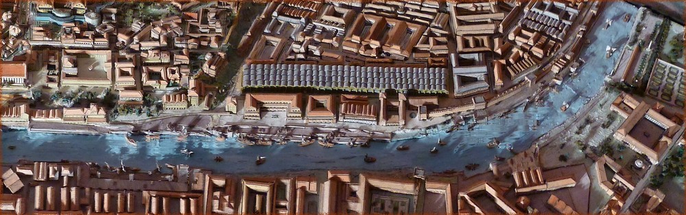 엠포리움은 테베레 강의 입구 옆에 위치한 거대한 창고 단지였다. 이곳에는 사방에서 들어오는 물품이 쌓여 있었다. 이 중 가장 큰 창고는 BC 193년도 조영관(아이딜리스)에 의해 건설된 거의 500 미터 길이에 달하는 아이밀리우스 포르티코라고 불리는 창고였다. 사진 상단에 트라스테베레의 강둑이 나타나 있다.