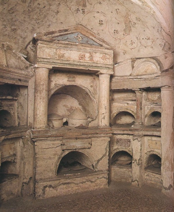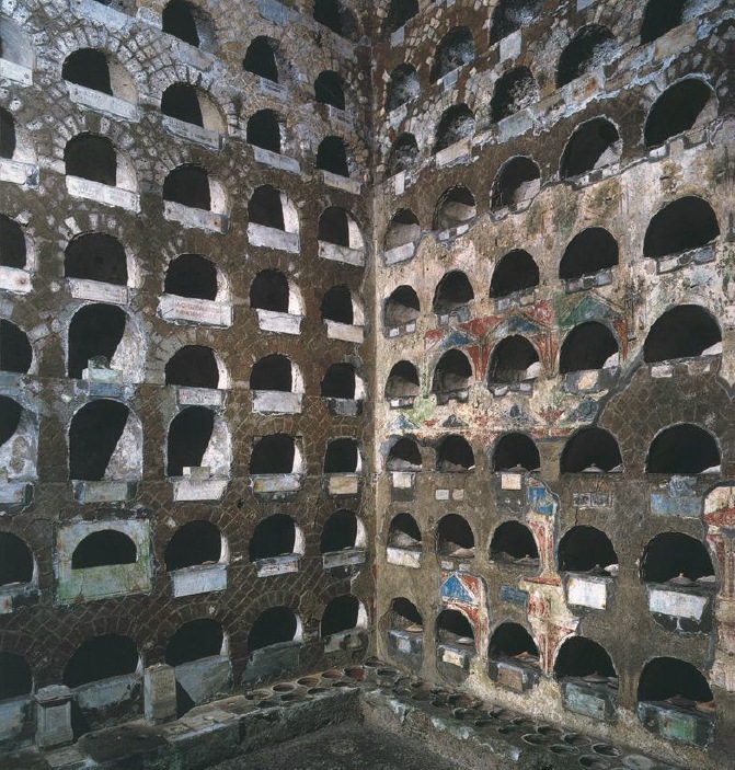 아우렐리아누스 성벽의 포르타 라티나. 콜룸바리움(카타콤, 지하 유골 안치소)은 유골 단지가 보관되는 벽 내부의 틈새로 구성된 일반적인 장례 공간이다. 포르타 라티나에 가까운 폼포니우스 힐라스의 콜룸바리움은 오늘날에도 비교적 잘 보존되어 있다. 폼포니우스 힐라스는 해방 노예였으며 아우구스투스와 티베리우스 아래에서 부자가 되었다. 그는 자신과 아내를 위해 이 콜룸바리움을 짓도록 했다.