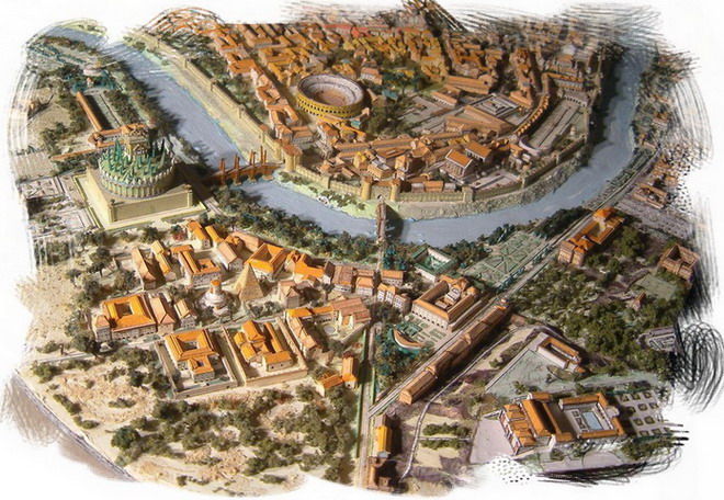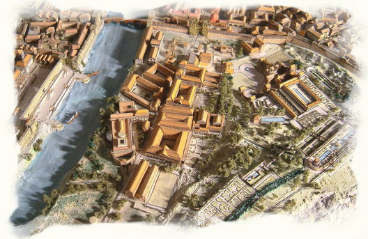 바티칸 쪽에서 본 이 조감도는 사진 하단에 있는 아그리피나 궁전의 위치와 드루수스의 정원을 보여준다. 중앙에 네로 다리가 있고 왼쪽에 아일리우스 다리와 하드리아누스 영묘가 있다.