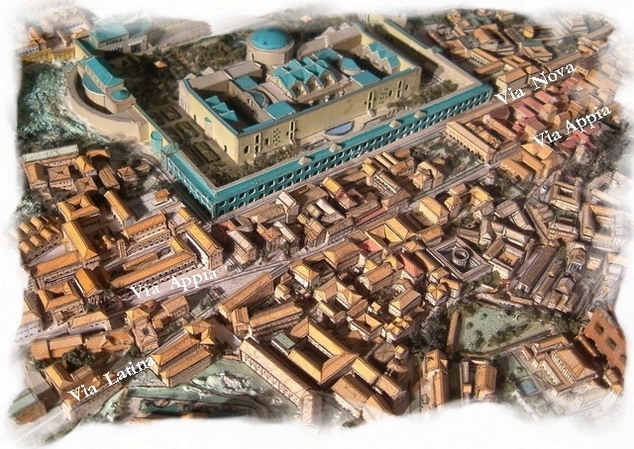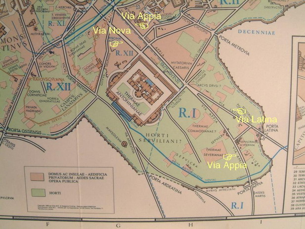 아피아 가도는 로마의 첫 번째 포장도로였다. BC 312년에 아피우스 클라우디우스 카이쿠스 집정관에 의해 건설되었으며 로마와 브린디시움을 연결했다. 여기 아피아 가도가 카라칼라 목욕탕을 지나는 모습을 볼 수 있으며, 포르타 아피아를 통해 도시를 빠져나갔다. 아피아 가도에 무덤이 늘어서 있는 곳은 아우렐리아누스 성벽 너머였다. 나중에 아피아 가도와 평행하게 노바 가도가 건설되었으며, 이 가도는 카라칼라 목욕탕과 직접 맞닿았다. 노바 가도는 훨씬 더 넓고 널찍한 도로였다.