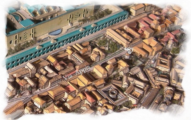 아피아 가도는 로마의 첫 번째 포장도로였다. BC 312년에 아피우스 클라우디우스 카이쿠스 집정관에 의해 건설되었으며 로마와 브린디시움을 연결했다. 여기 아피아 가도가 카라칼라 목욕탕을 지나는 모습을 볼 수 있으며, 포르타 아피아를 통해 도시를 빠져나갔다. 아피아 가도에 무덤이 늘어서 있는 곳은 아우렐리아누스 성벽 너머였다. 나중에 아피아 가도와 평행하게 노바 가도가 건설되었으며, 이 가도는 카라칼라 목욕탕과 직접 맞닿았다. 노바 가도는 훨씬 더 넓고 널찍한 도로였다.