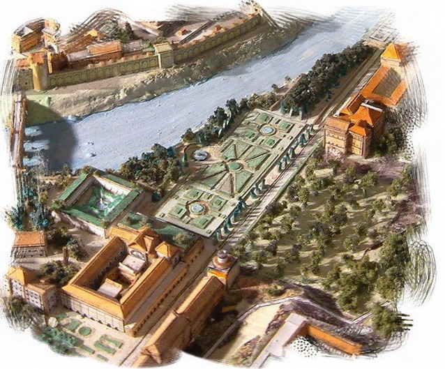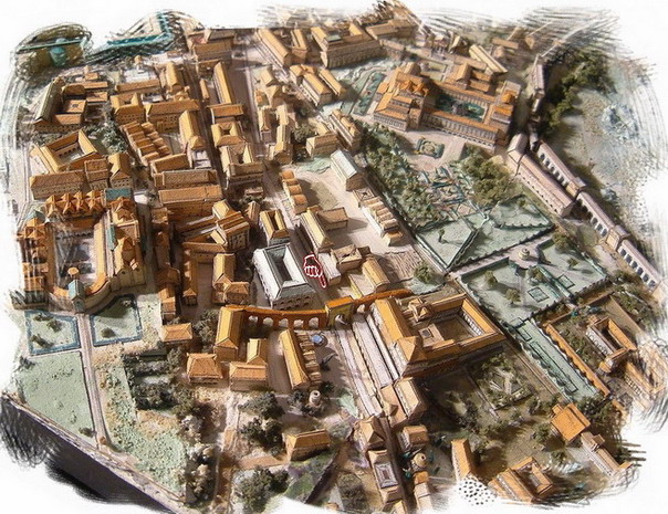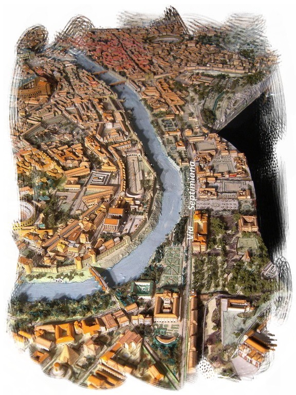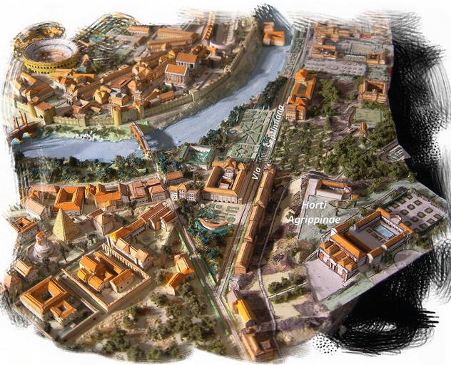 바티칸 쪽에서 본 이 조감도는 사진 하단에 있는 아그리피나 궁전의 위치와 드루수스의 정원을 보여준다. 중앙에 네로 다리가 있고 왼쪽에 아일리우스 다리와 하드리아누스 영묘가 있다.