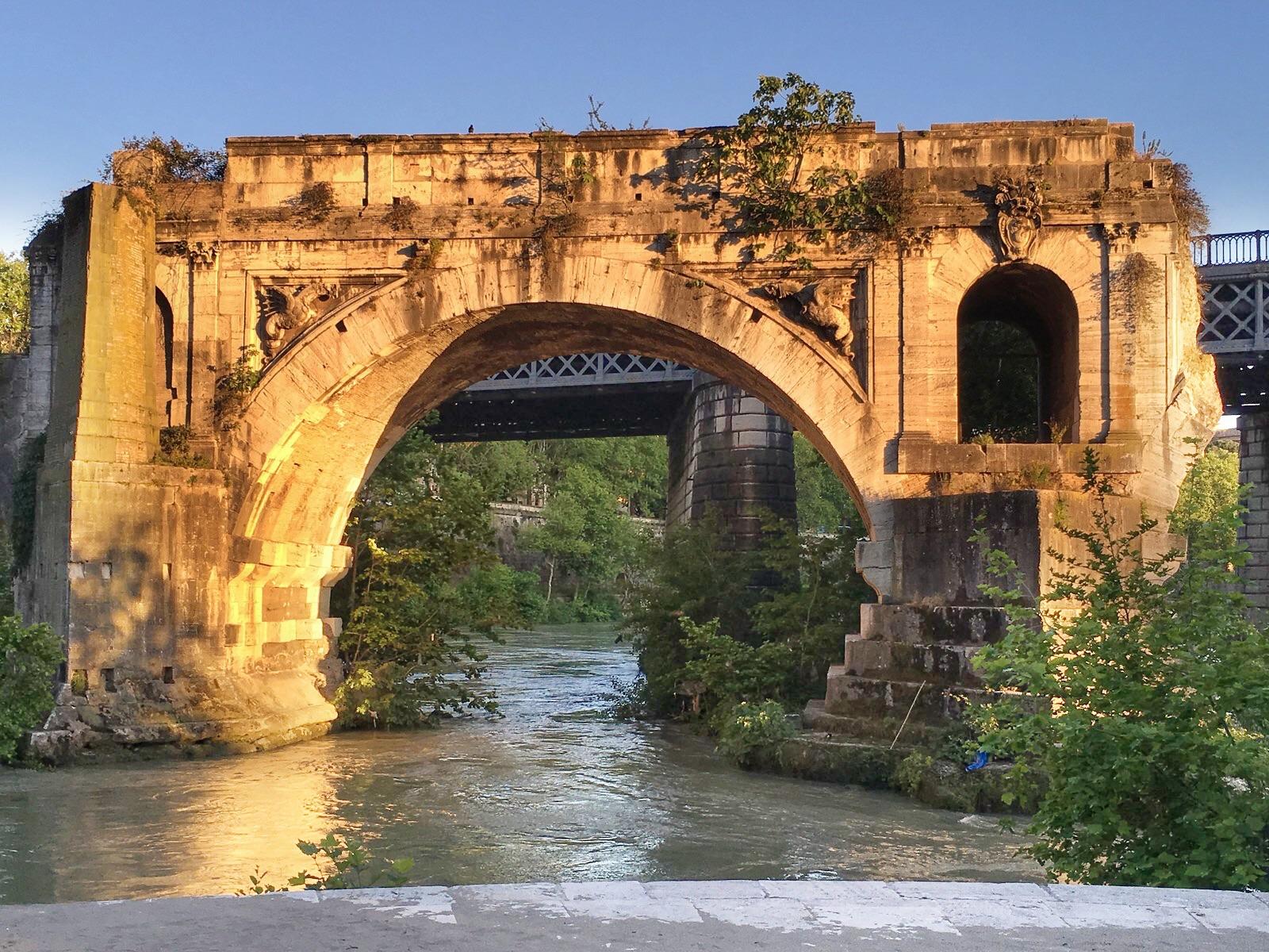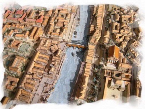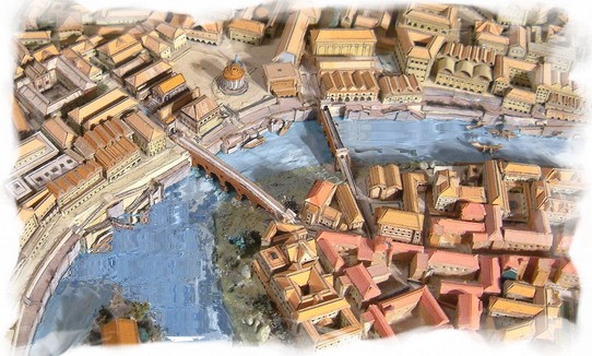 전경에 있는 BC 60년에 건설된 아이밀리우스 다리는 오른쪽의 트라스테베레 지점과 왼쪽의 포룸 보아리움 및 올리토리움을 연결했다.