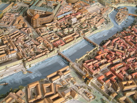 사진의 아래쪽에는 테베레 강 건너편에 있는 아우렐리아누스 성벽으로 이어지는 아그리파 다리가 있다. 두 번째 다리는 아우렐리우스 다리이다.