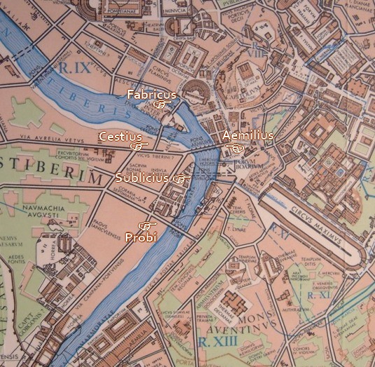 파브리쿠스, 케스티우스, 아이밀리우스, 수블리키우스, 프로부스 다리를 가리키는 지도