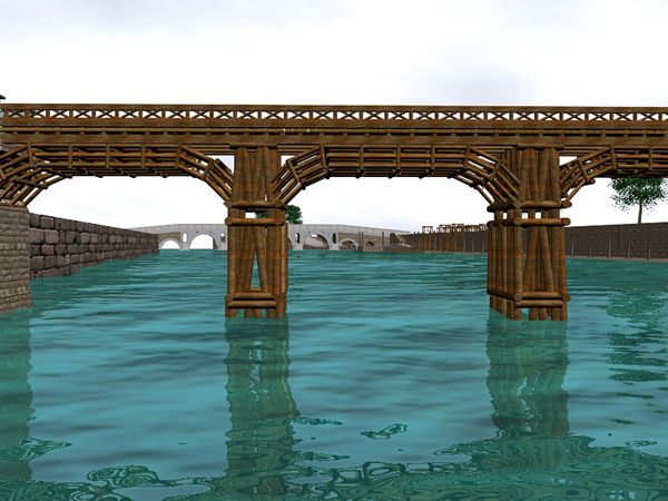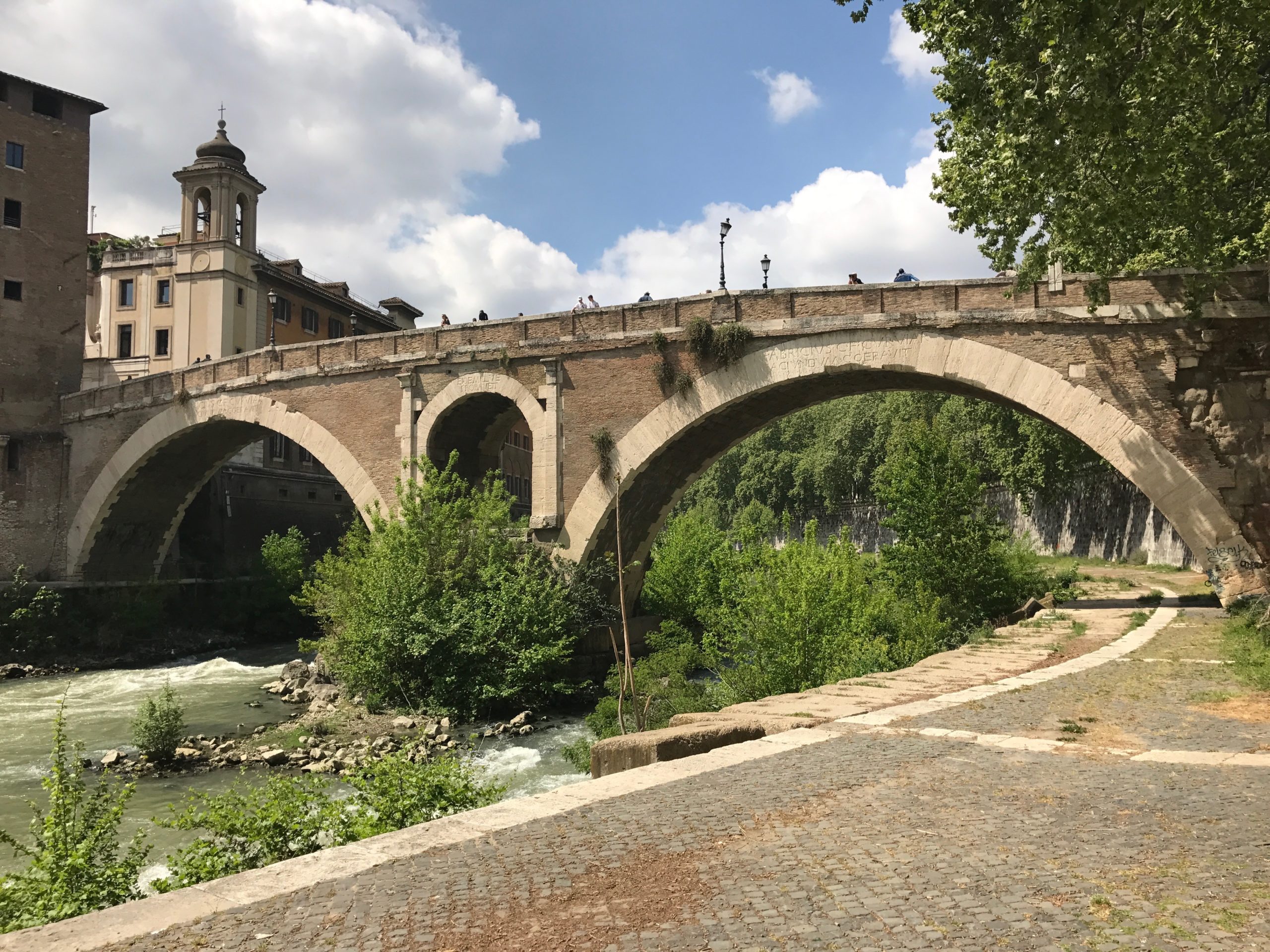 오른쪽에 있는 케스티우스 다리와 왼쪽에 있는 파브리키우스 다리는 테베레 섬과 본토를 연결했다. 다리는 오늘날에도 여전히 같은 장소에 있다. 케스티우스 다리는 석회질 벽돌로 재건해야 했다. 테베레 섬의 끝에는 아이스쿨라피우스(로마 의학의 신)의 신전이 있었다. 이 사원은 BC 291년에 세워져 치료 장소가 되었다.