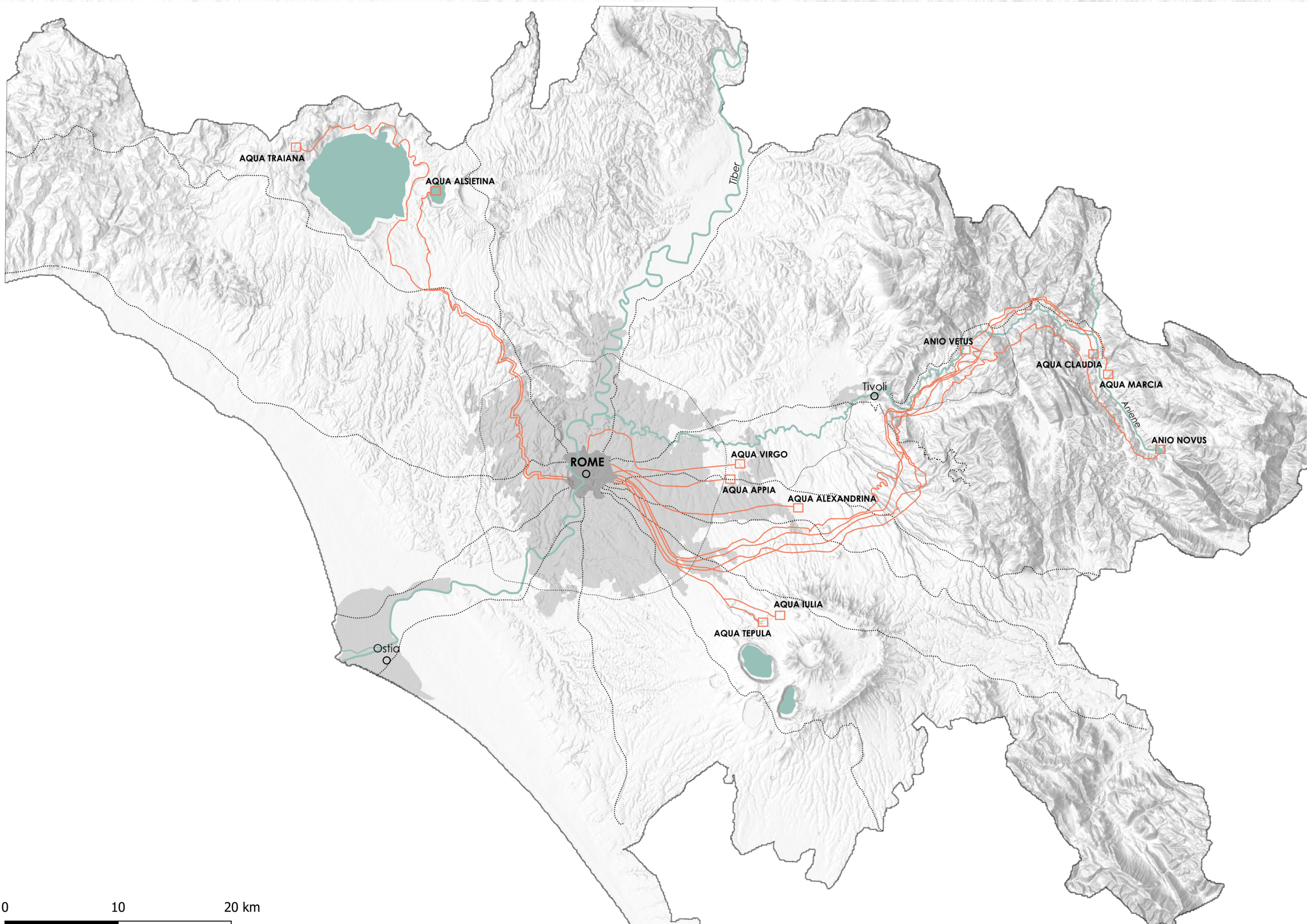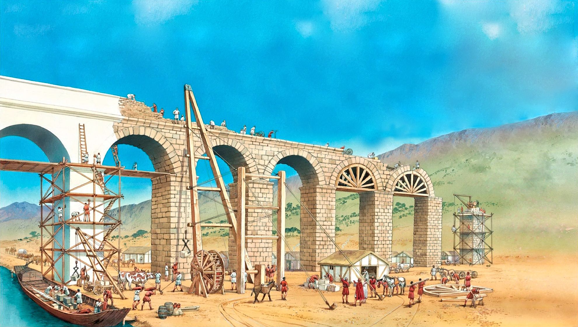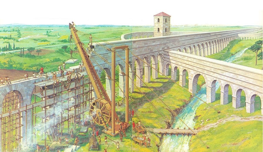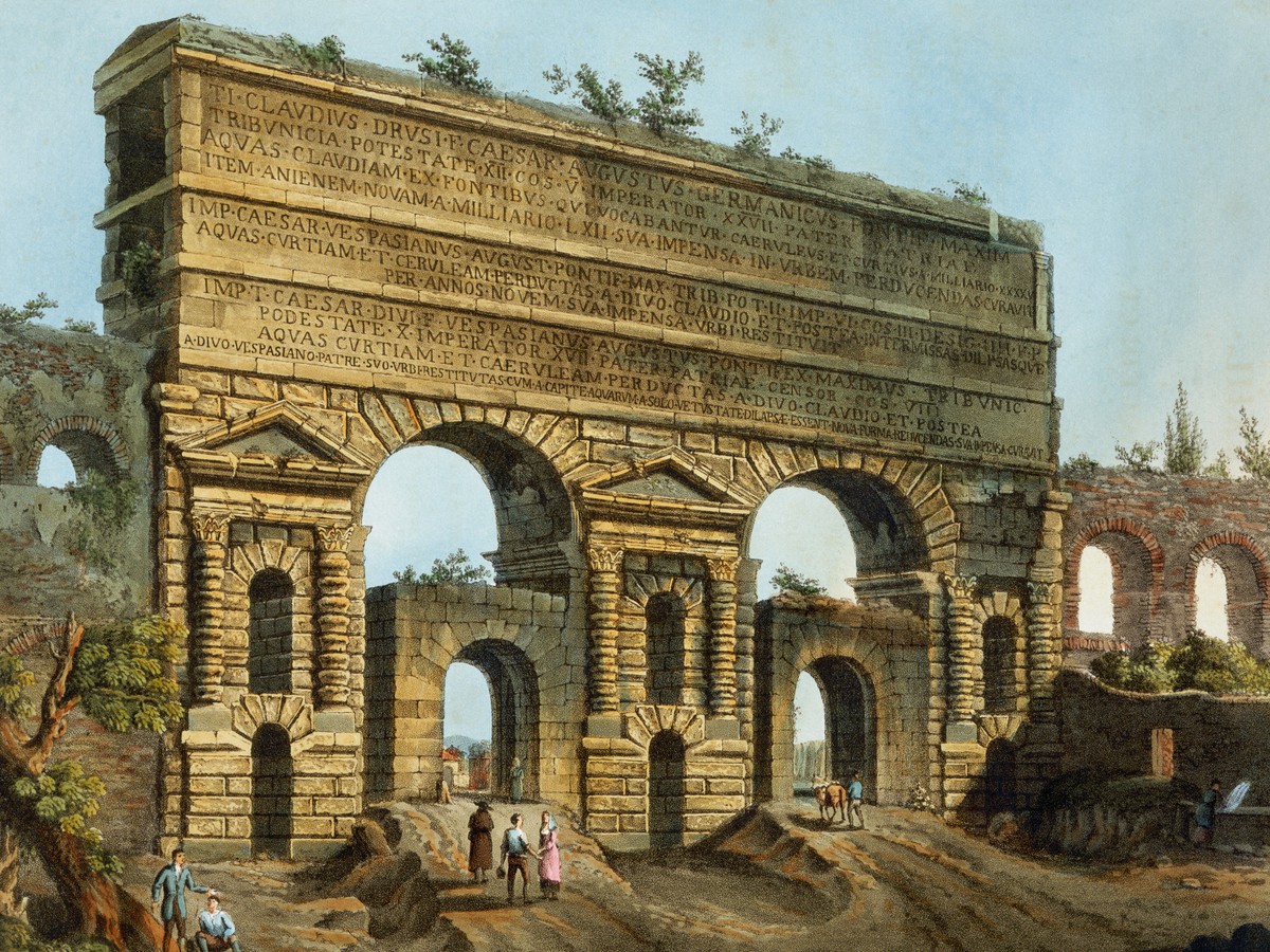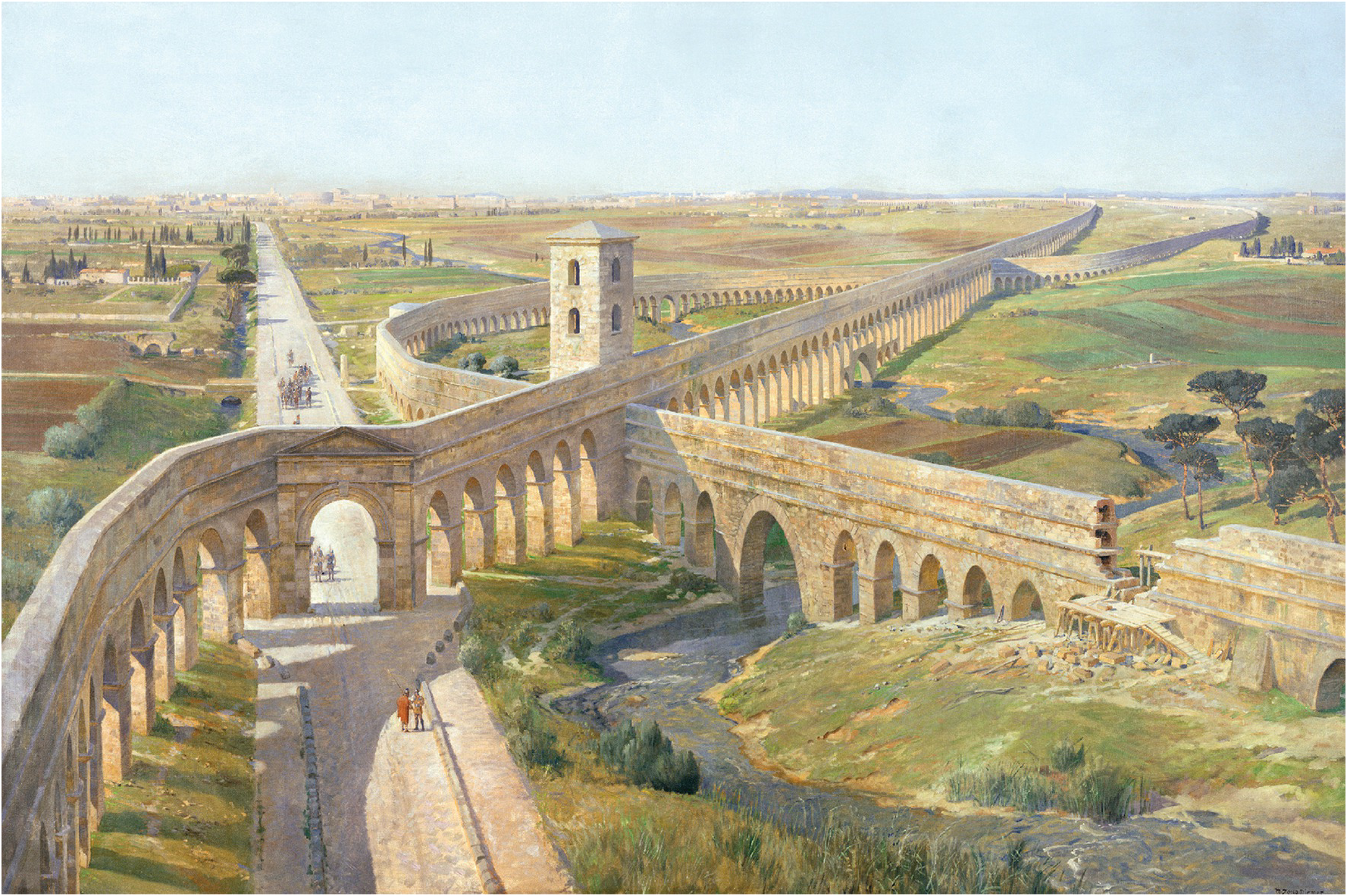 두 수도교가 모두 지상 위로 나와있다. 배경에는 거대한 수도교 클라우디아가 있다.