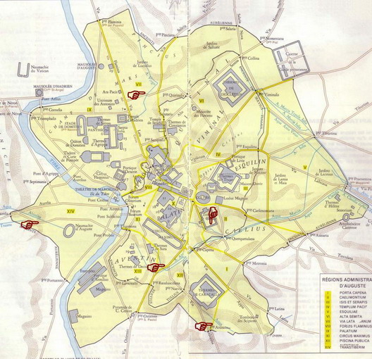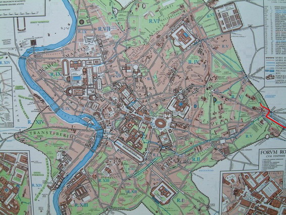 사진 중앙에서 아쿠아 클라우디아를 볼 수 있다. 이 공공사업은 로마에서 가장 주목할만한 것 중 하나이다. 클라우디우스 황제 아래에서 완성되었으며 팔라티노(왼쪽 상단)의 비탈에 식수를 공급하고 로마에서 68 km 떨어진 산지에 수원을 두고 있었다. 사진의 중앙에서 첼리오 언덕을 통과하고, 중간에 클라우디우스 신전에 의해 형성된 넓은 건축 단지를 따라 지나간다.