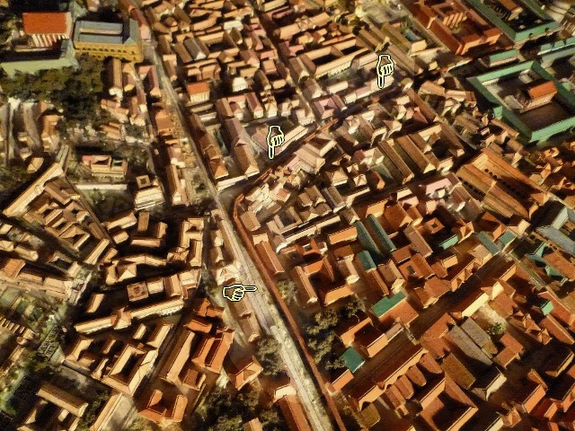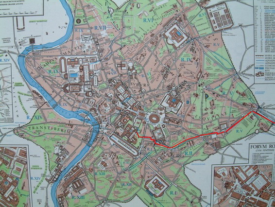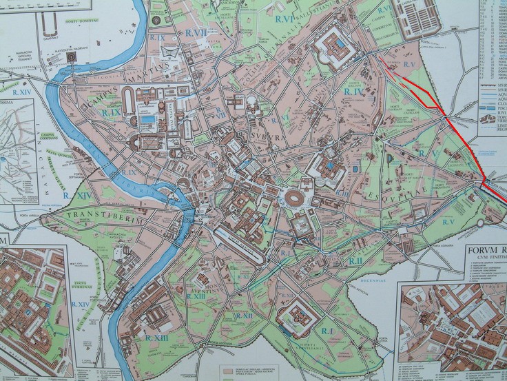 사진 상단에 있는 캄푸스 마르티우스를 향해 구부러지기 직전의 아쿠아 비르고의 부분적인 모습.