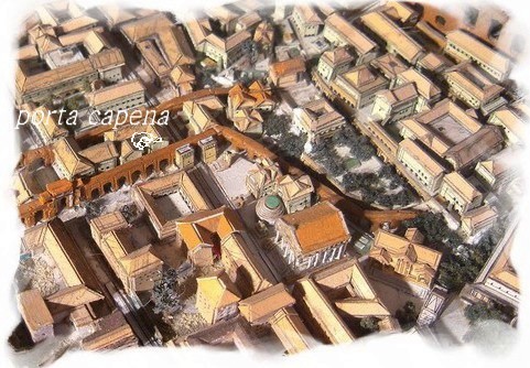 첼리오 언덕 아래 수도교가 지하로 들어가는 초입 부분의 조감도. 사진 상단의 전경에 보이는 문은 포르타 카페나이다.