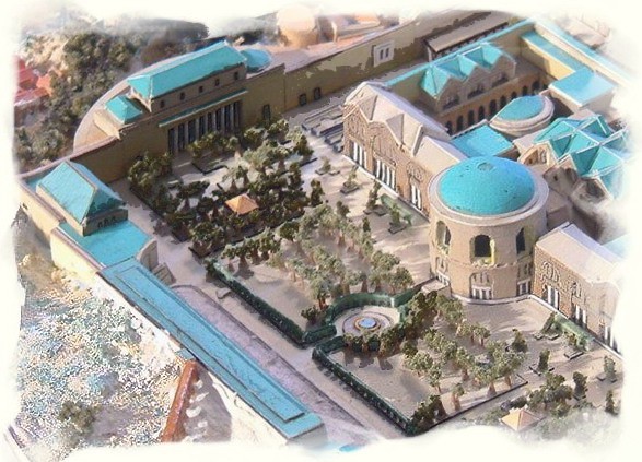 거대한 외부 욕장의 파사드 위(그림의 왼쪽 상단)에는 조각상과 장식된 띠 조각으로 풍성하게 꾸며진 5개의 작은 사원이 방문객들에게 인상적인 화려함을 선사했을 것이다.