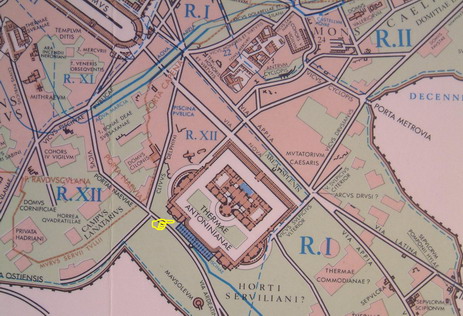 더 멀리서 보면 사진 왼쪽에 있는 목욕탕에 물을 공급한 아쿠아 안토니니아나의 연결을 더 잘 볼 수 있다. 목욕탕 뒤로 가는 길은 키르쿠스 막시무스 근처에서 끝나는 아르데아티나 가도이다.