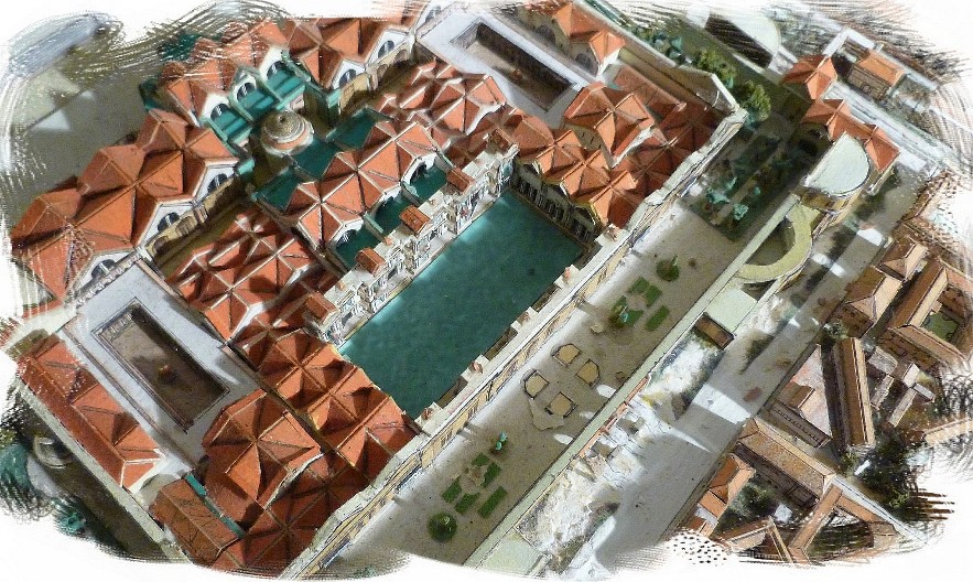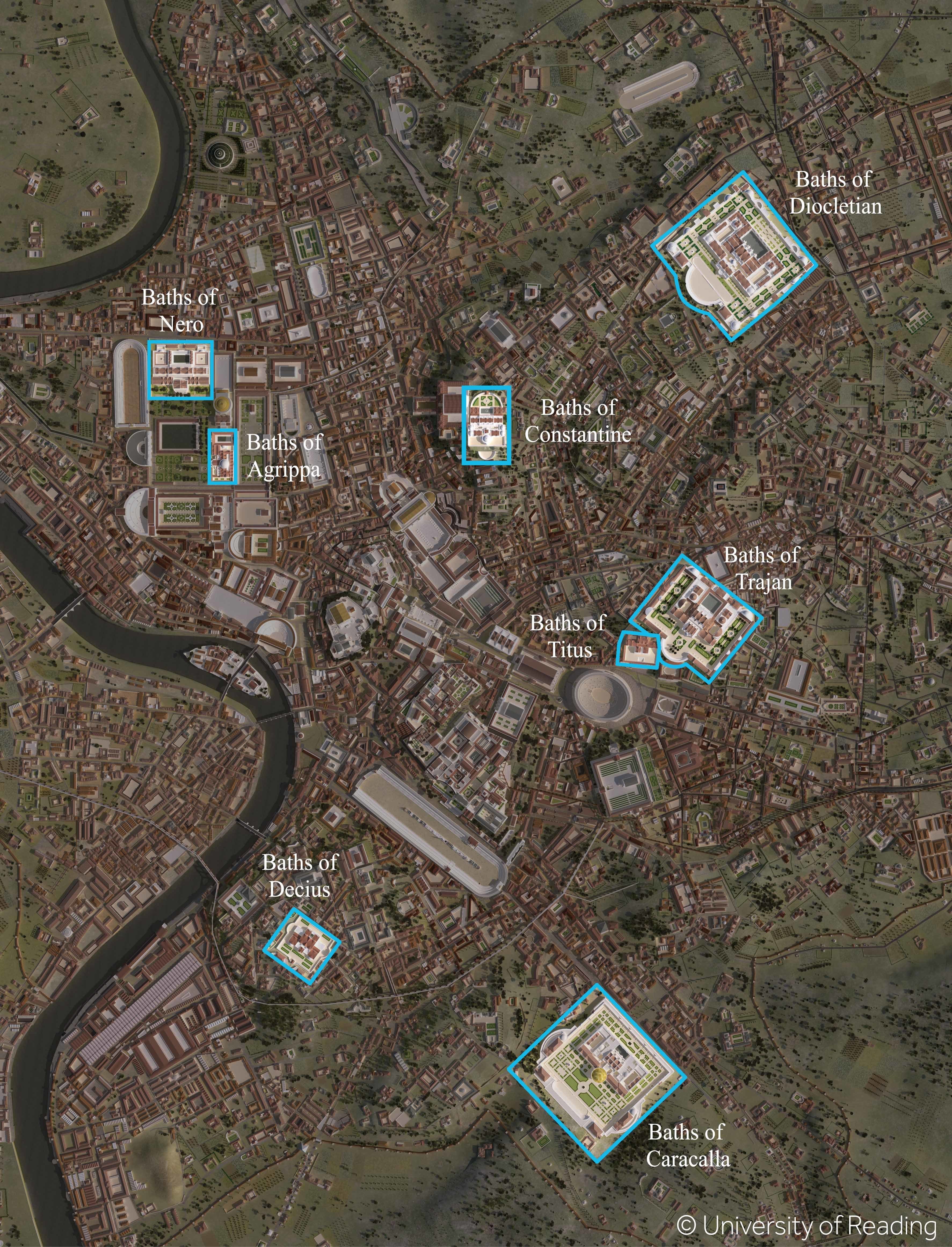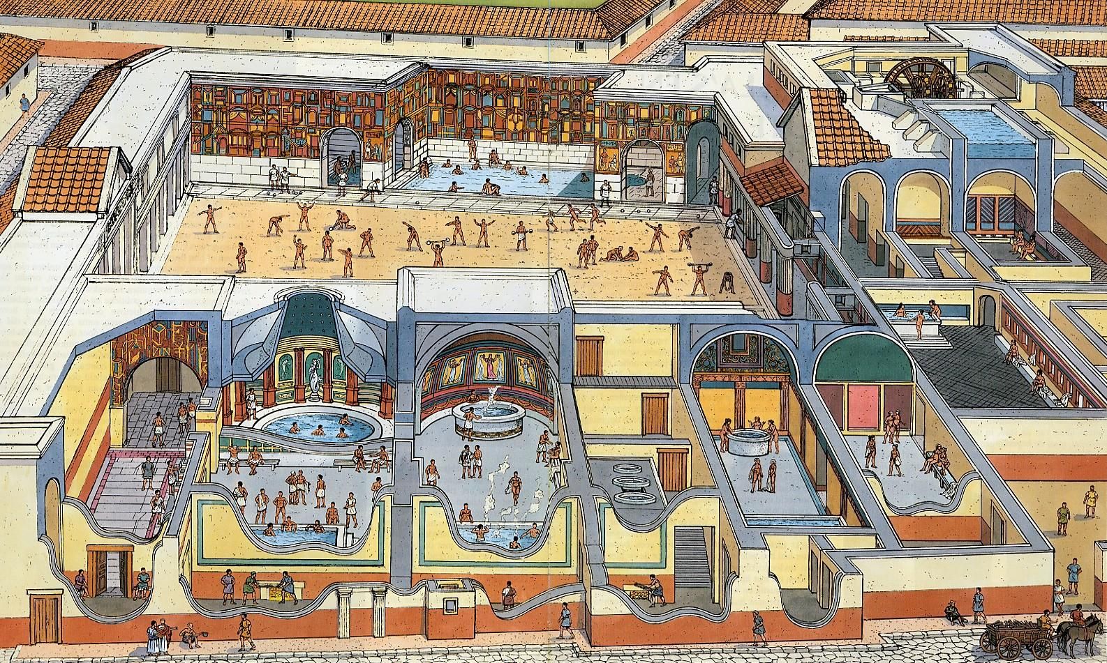 고대 로마와 로마의 목욕탕을 분리하는 것은 불가능할 것이다. 대중목욕탕의 이용은 전 민중에게 즐거움이자 휴식이었으며 저렴했다. BC 33년에 아우구스투스의 오른팔인 아그리파는 이 목욕탕을 지음으로써 자신의 책무를 나타내기를 원했고 출입이 자유로울 것이라고 암시했다. 이 원칙은 그때부터 후대에 개방될 모든 다른 황제 목욕탕의 규칙이 되었다. 여기 사진의 중앙에는 아그리파 목욕탕과 왼쪽 중앙에 있는 거대한 야외 욕장이 있다.