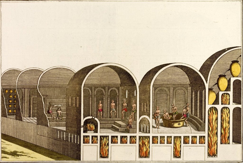 회랑으로 둘러싸인 안뜰 한가운데에 냉욕장과 정원을 발견할 수 있다. 주변에는 홀, 탈의실, 체육관, 온수 욕장, 로마인에게 즐거움과 휴식을 제공할 수 있는 모든 것이 있는 본관이 있었다.