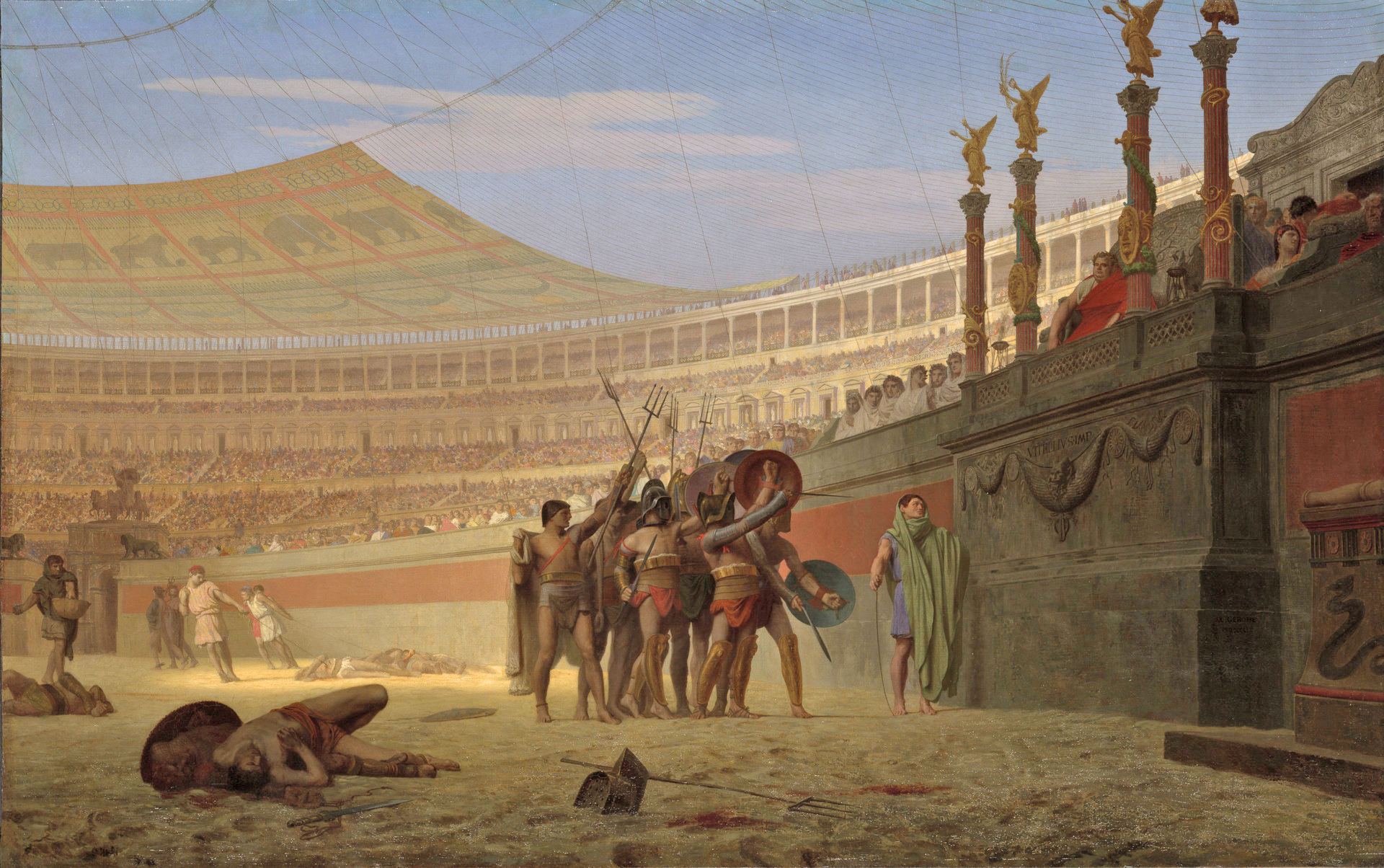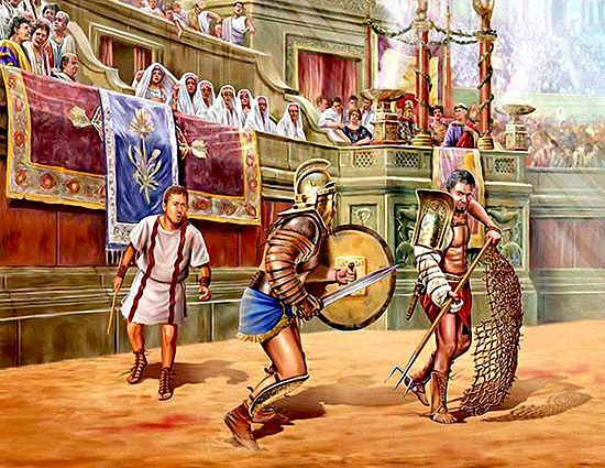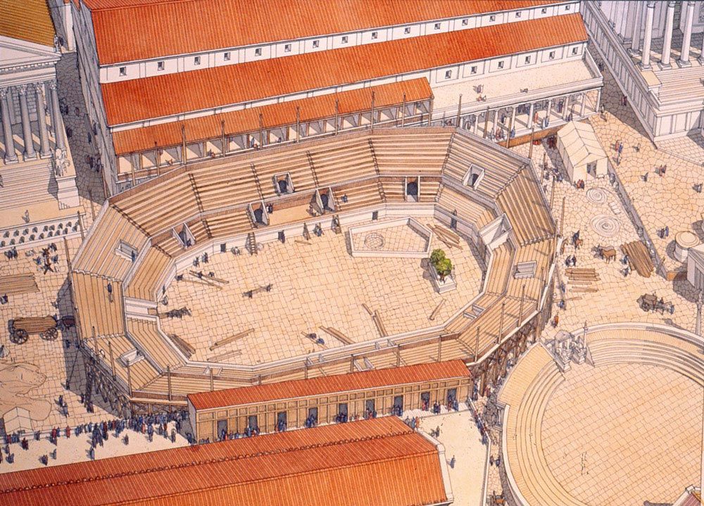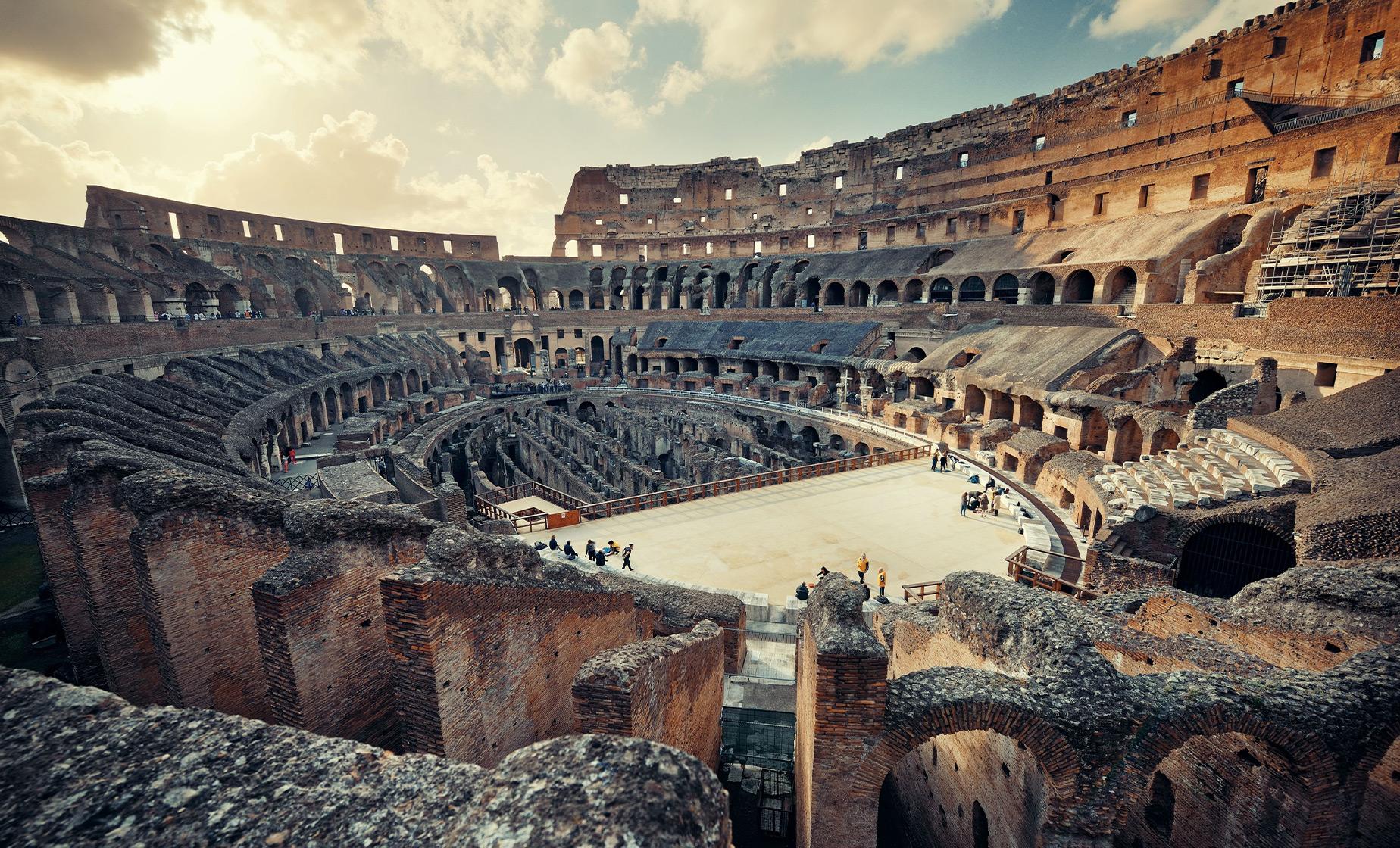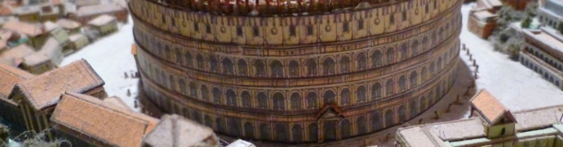 콜로세움(또는 플라비우스 원형경기장)은 둘레가 527 미터, 높이가 57 미터로 약간 타원형이었다. 경기장은 4개의 단을 가지고 있었고, 그중 3개 단은 회랑이 있었다. 청중을 햇볕이나 비로부터 보호하기 위해 대부분의 좌석을 가릴 수 있는 지붕 가장자리에 말아놓은 린넨(벨룸) 차양을 당길 수 있었다. 이 기념물은 고풍적인 세상에서 가장 인상적인 것 중 하나임은 의심의 여지가 없다. 내부도 그만큼 매력적이었다.