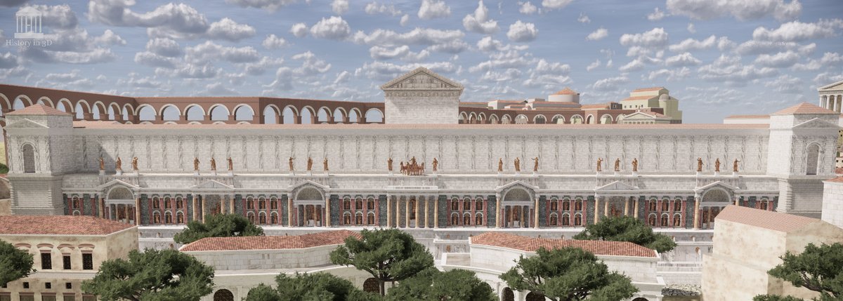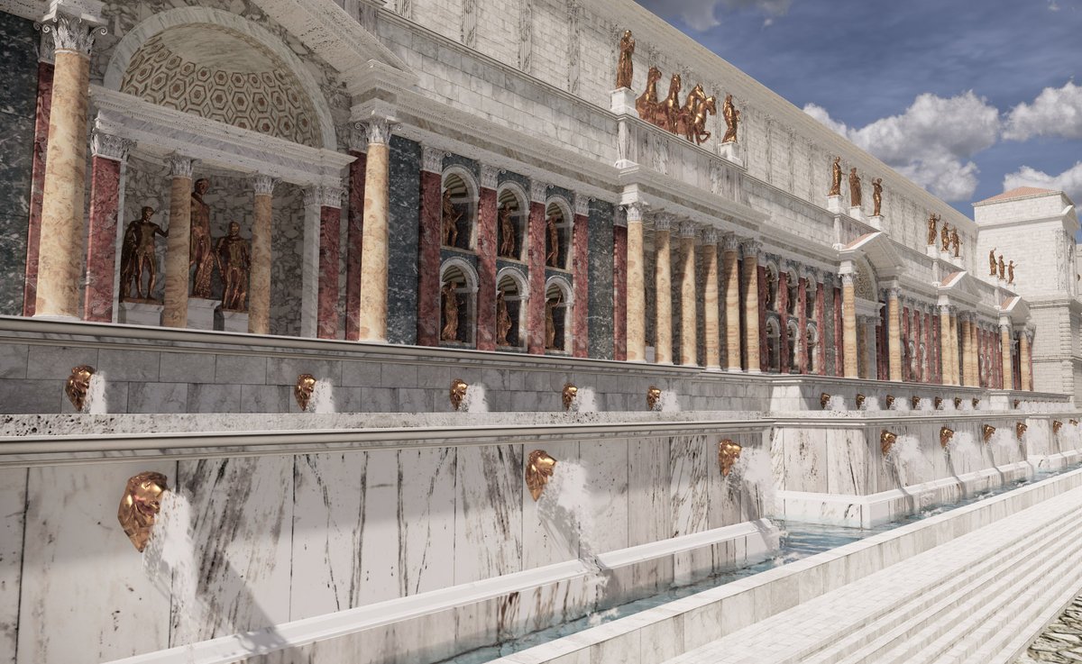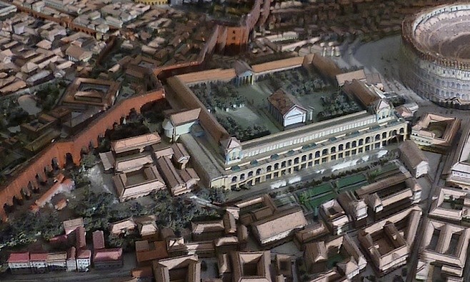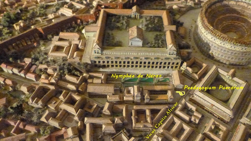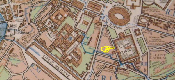 이 사진은 신격 클라우디우스의 복합 건물을 지탱하는 거대한 부벽을 보여준다. 긴 계단 위에 있는 두 개의 대문인 사진 오른쪽의 북문과 상단 부분에 있는 서문이 개방되었다. 동쪽의 주랑 현관을 따라 네로의 님페아라고 알려진 긴 정원을 볼 수 있다. 비쿠스 카피티스 아프리카이의 모퉁이에는 제국의 노예들을 가르치는 파이다고기움 푸에로룸이라는 중요한 건물이 있었다.