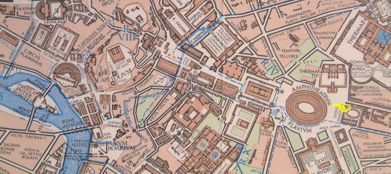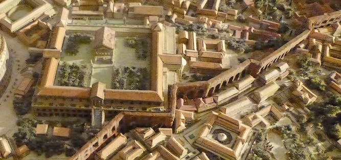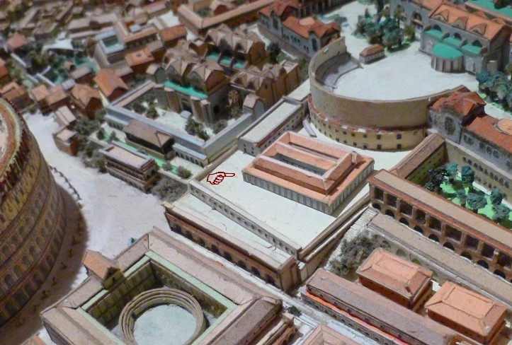 다키아 양성소(루두스 다키쿠스)는 오른쪽에 반원형 담장이 나타나 있는 트라야누스 목욕탕 기슭에 있는 오피우스 언덕 꼭대기에 세워졌다. 같은 높이로, 사진 오른쪽 하단에는 넓은 창문이 달린 직사각형 모양의 거대한 건물, 미세누스 선원들의 막사가 있다.