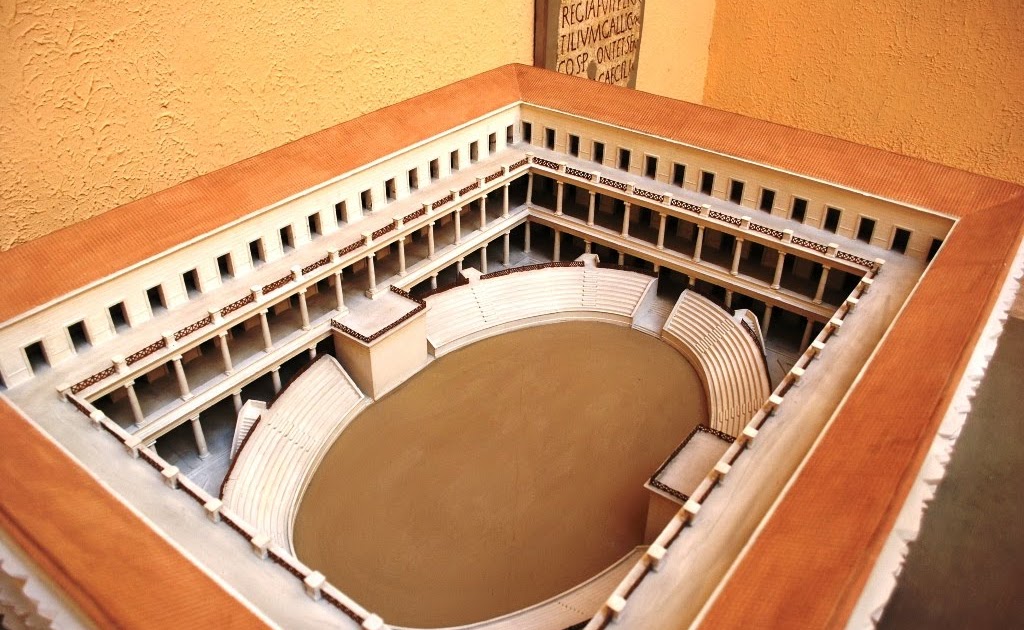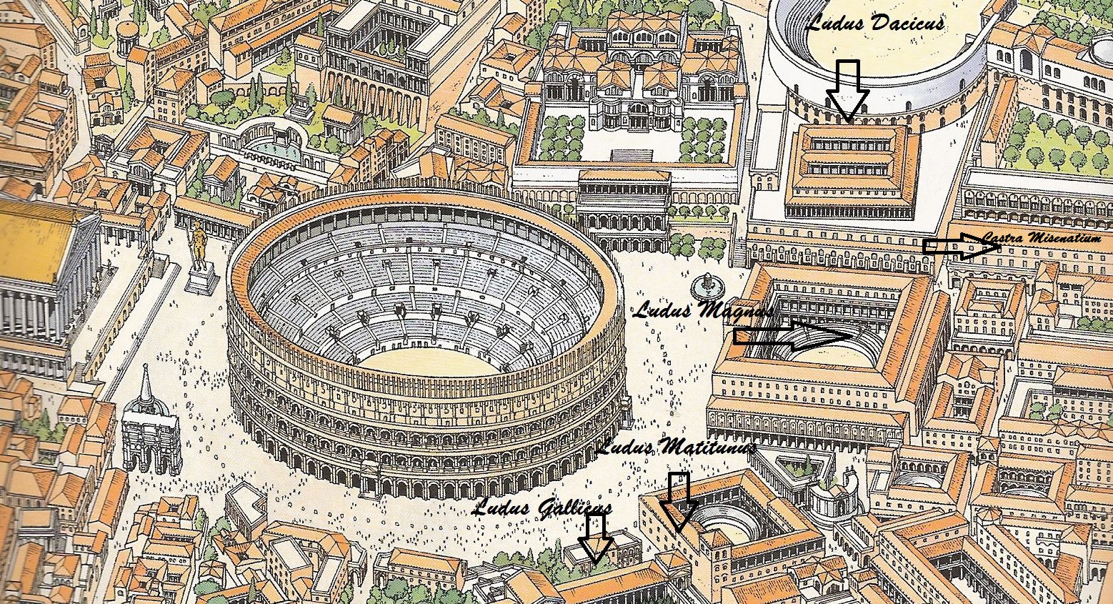 알려진 네 개의 위대한 제국 검투사 양성소를 세운 것은 도미티아누스 황제이다. 주된 양성소는 사진 중앙에 표시된 커다란 양성소(루두스 마그누스)였다. 네 개의 양성소는 콜로세움 근처에 위치해 있었다. 황제 콤모두스가 그들을 자주 방문했다.