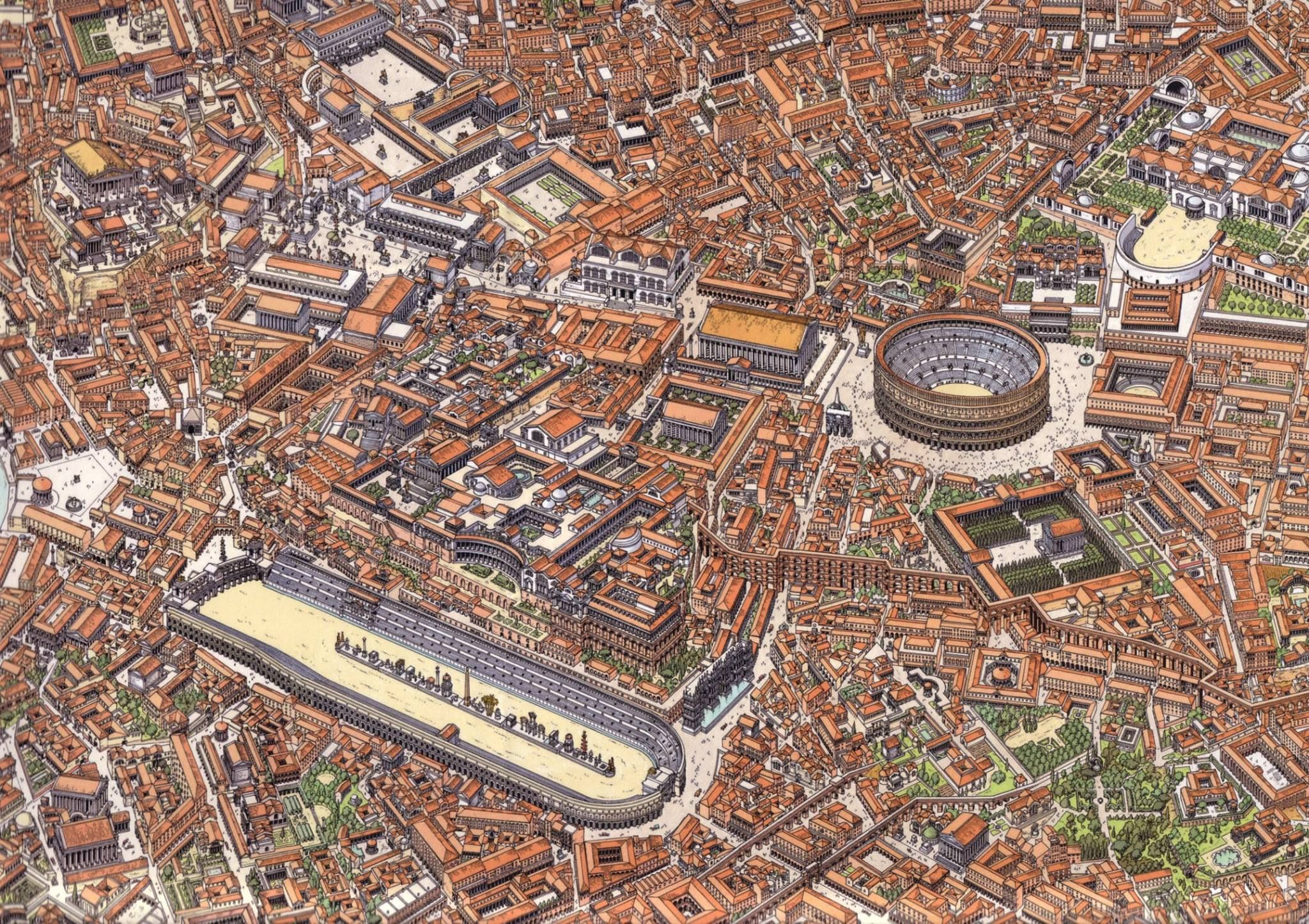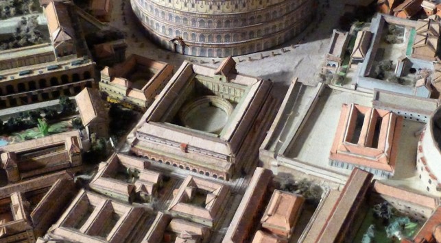 콜로세움과 그 웅장한 장소. 왼쪽에 클라우디우스 신전의 부벽이 있다. 앞에는 검투사 학교인 "루디 글라디아토리"가 있다. 오른쪽에 티투스 목욕탕이 있다. 배경에서 베누스와 로마의 신전을 추측할 수 있다. 콜로세움은 로마 포룸의 입구 바로 옆에 있는 기념비적인 건축물이었다.