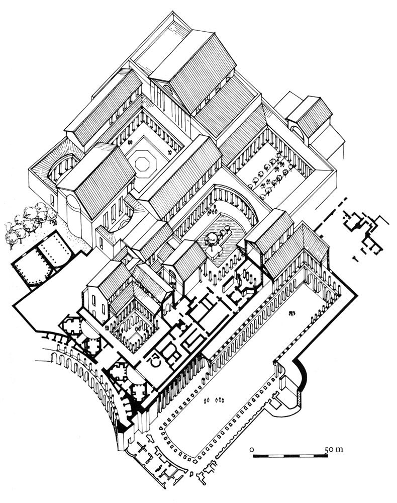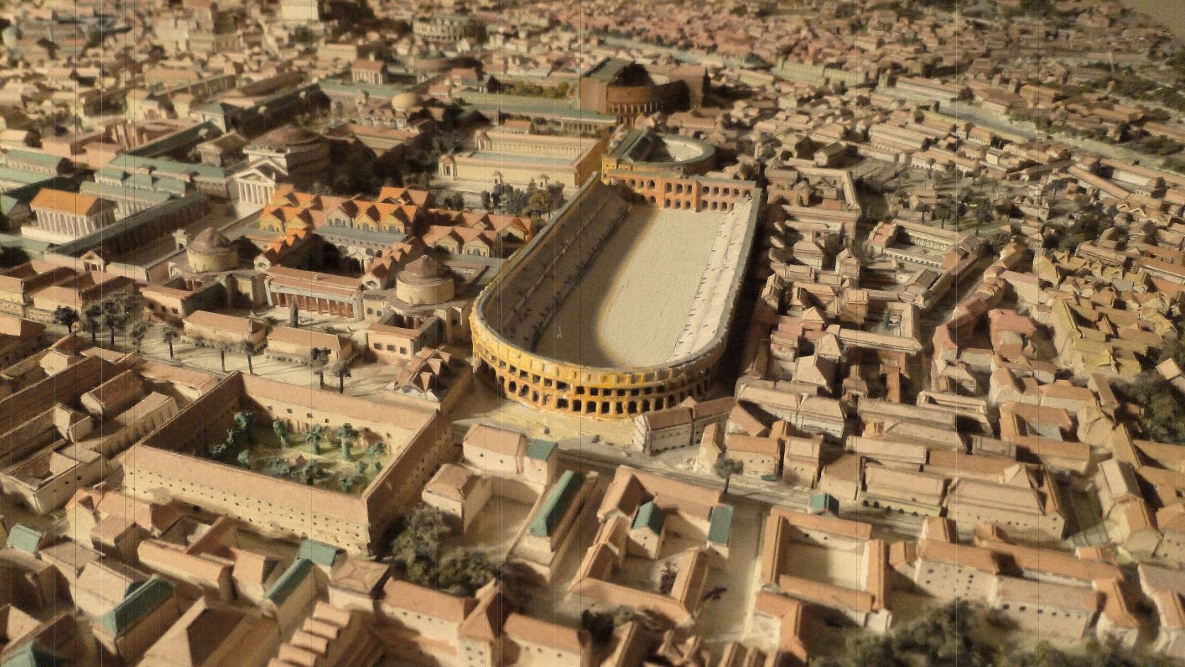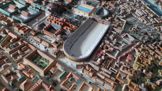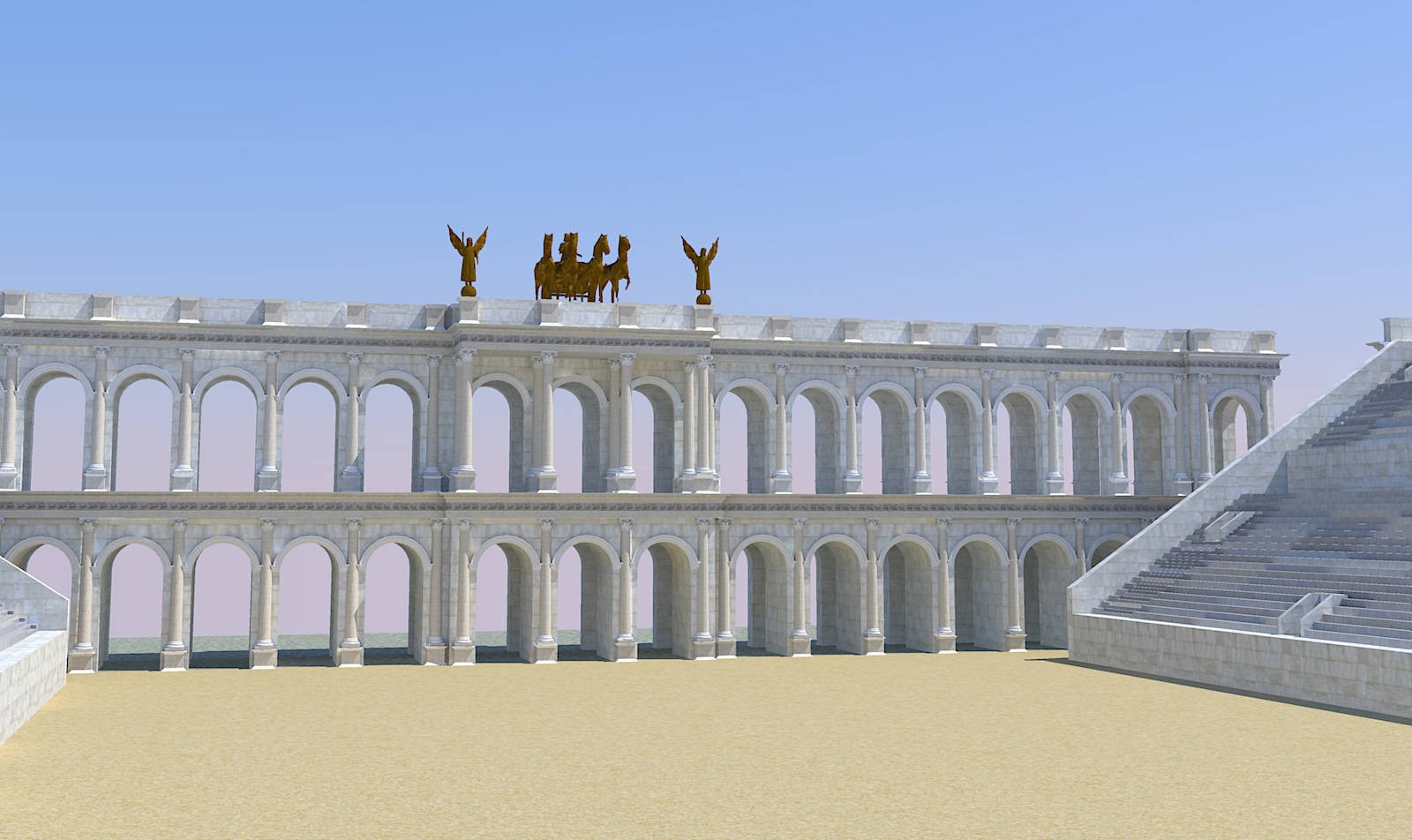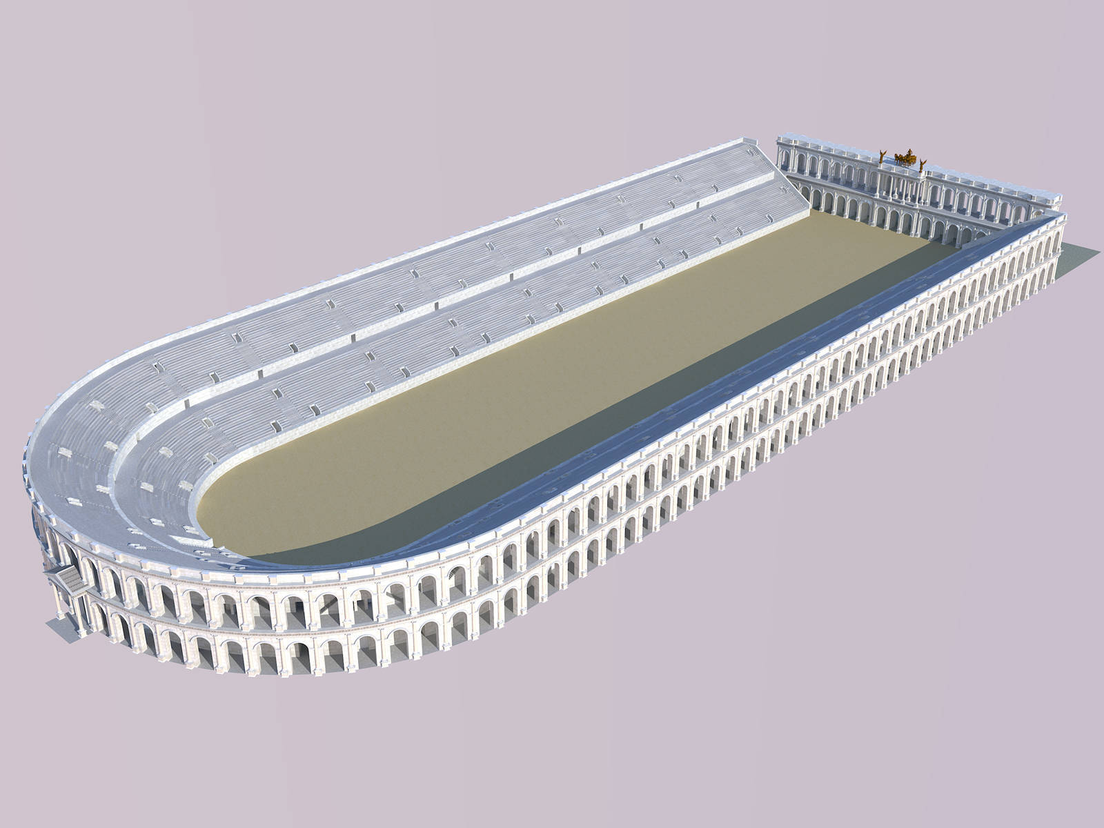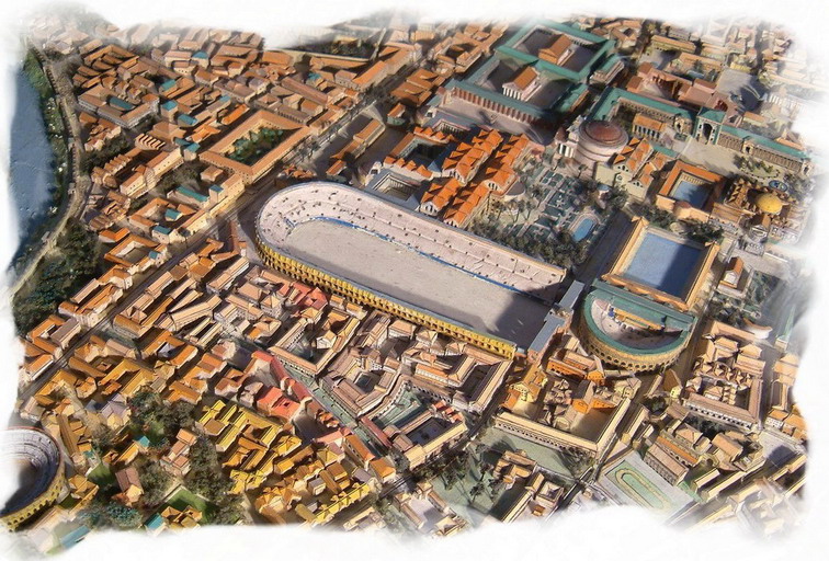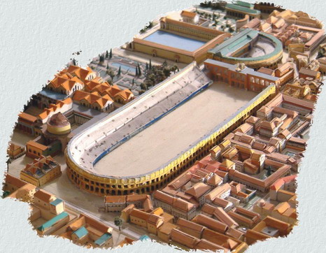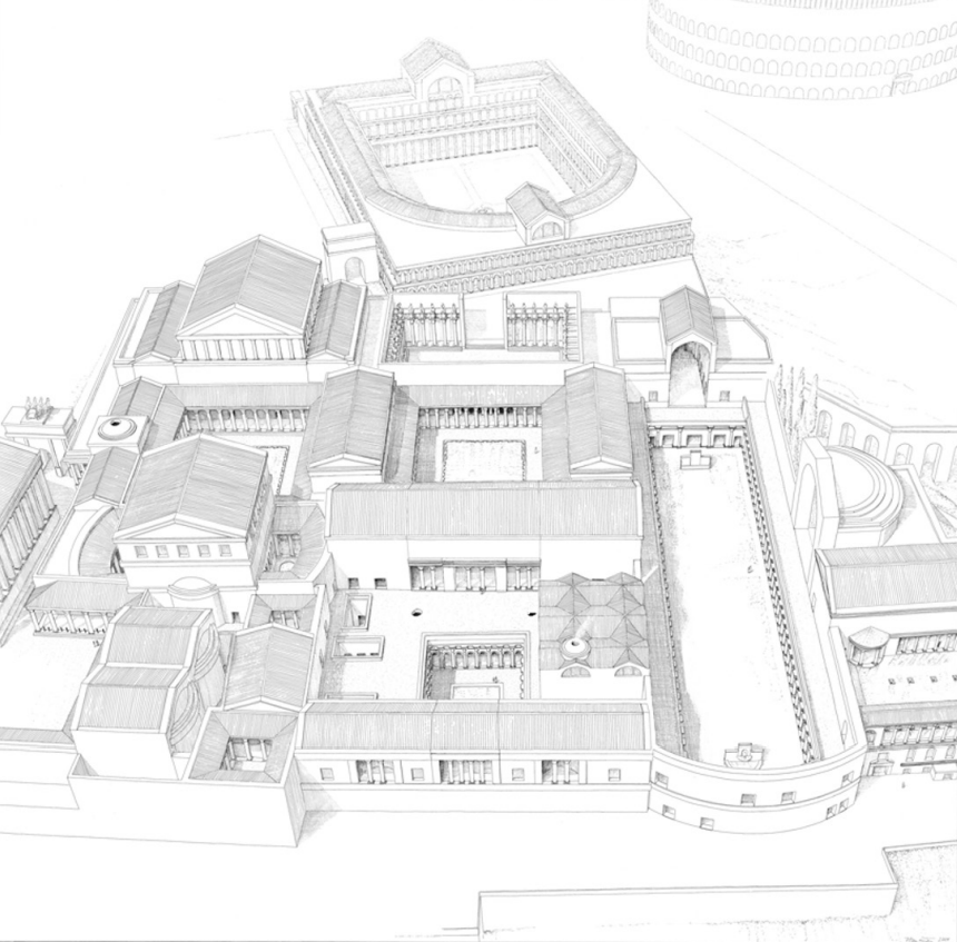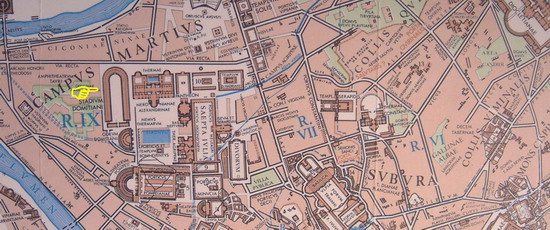 도미티아누스 황제 아래에 세워진 또 다른 경기장의 조감도. 히포드로모스라고도 불리는 이 경기장은 팔라티노의 도무스 아우구스타나와 셉티미우스 세베루스 목욕탕 사이에 지어졌다. 실제로 길이 145 미터의 크게 움푹 들어간 곳이었고 주랑 현관으로 둘러싸여 있었다. 이 경기장이 황제 전용 경기장으로 사용되었는지, 아니면 일반인에게 개방된 정원과 운동 장소였는지는 분명하지 않다. 경기장 오른쪽(가운데)에 황실을 위한 좌석이 있던 반원형의 돔이 보인다.