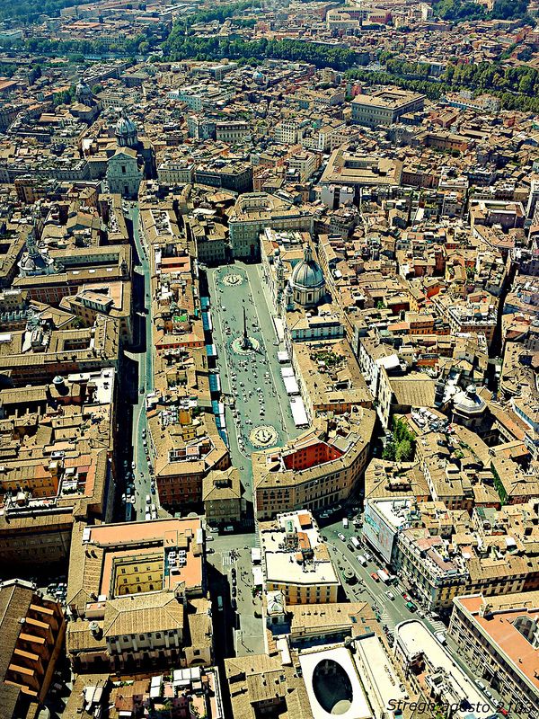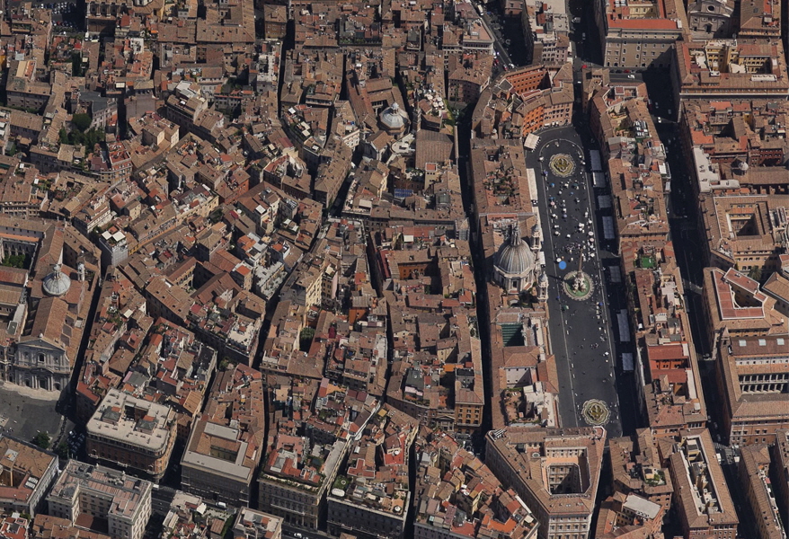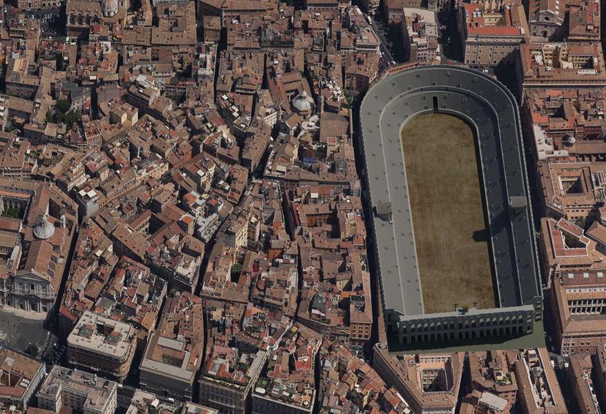 다른 각도에서 본 도미티아누스 스타디움. 스타디움에서 조금 더 왼쪽으로 가면 네로 목욕탕의 정원(작은 빨간 지붕과 노송 나무가 있는 정원)과 오른쪽 위에 오데움(녹색 지붕을 가진 반원형 극장)이 있다.