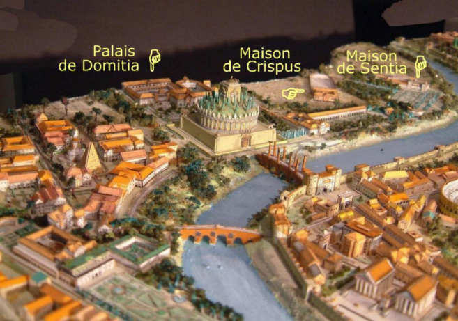 테베레 강이 하드리아누스의 영묘 쪽으로 굽이쳐 있는 곳에는 아우구스투스의 첫 부인인 스크리보니아의 어머니였던 센티아의 거대한 저택이 나타난다. 정원과 건물의 넓이는 궁전이 호화롭다고 생각하게 했다. 크리스푸스의 저택 바로 위에 위치한 센티아의 사유지가 사진 중앙에 있다.