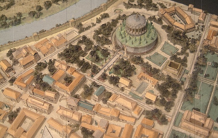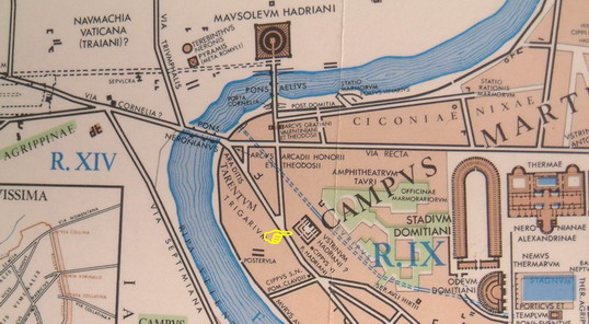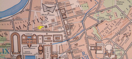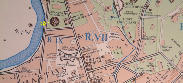 하드리아누스의 우스트리눔은 캄푸스 마르티우스의 서쪽 지점에 지어졌다. 미로처럼 된 특징적인 모양으로 사진 중앙에서 쉽게 찾을 수 있다.