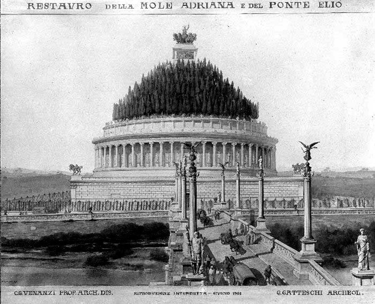 하드리아누스의 영묘와 매우 가까운 곳에 고대 장례 기념물인 이른바 로물루스의 피라미드(메타 로물리)가 서 있었다. 이 피라미드는 중세시대에 로물루스의 무덤으로 여겨졌다. 이 기념물은 16세기 초에 파괴되었다. 사진의 거의 중앙에 로마 도로를 따라 있는 것을 볼 수 있다.