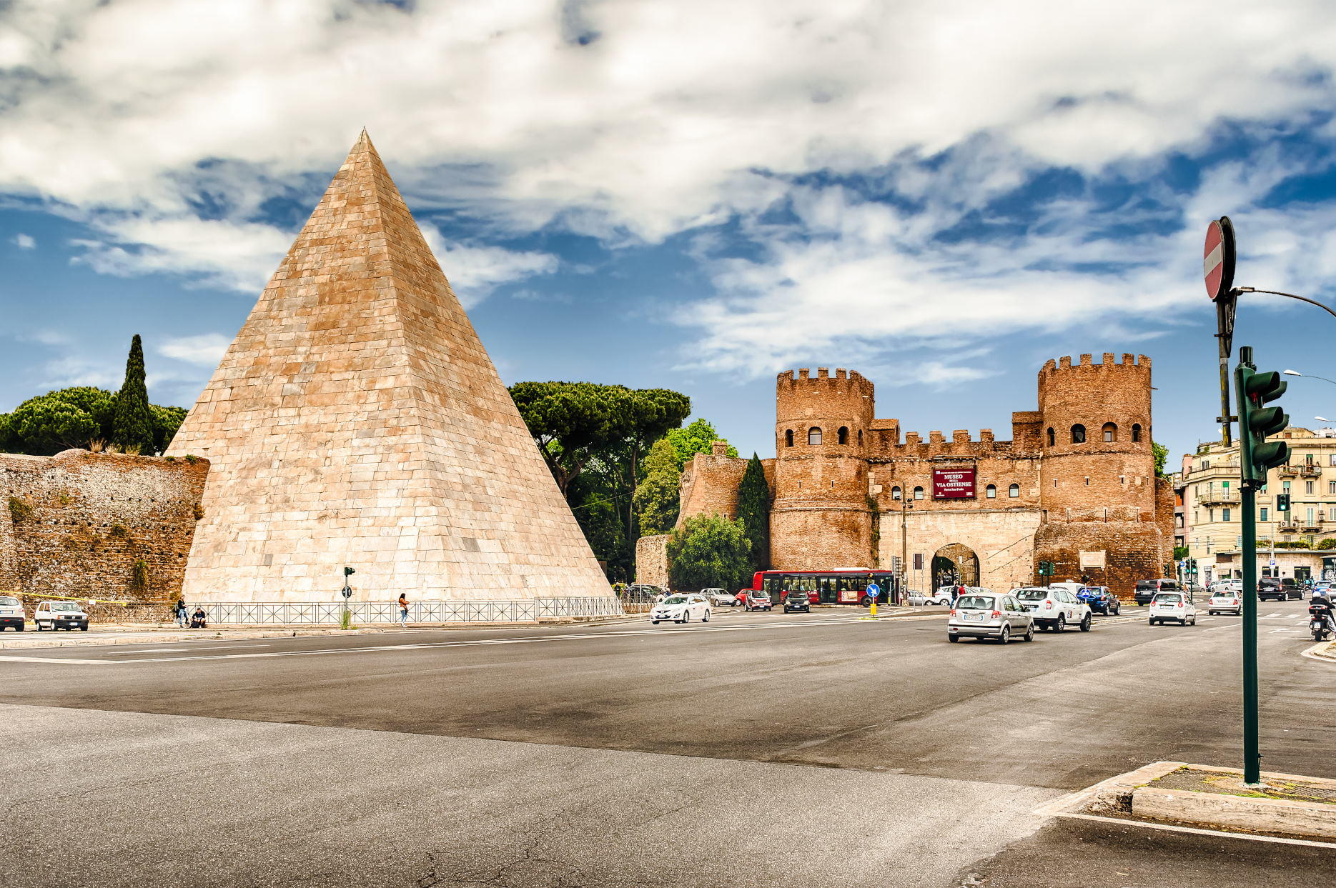 카이우스 케스티우스의 피라미드. BC 12년에 죽은 이 행정 장관은 피라미드 모양의 무덤을 지었다. 무덤은 후대에 법으로 성벽 내의 무덤을 금지했기 때문에 아우렐리아누스 성벽에 포함되었다. 하얀 대리석으로 뒤덮인 이 기념물은 오늘날까지도 그대로 남아 있다. 중세에는 로물루스의 동생 레무스의 무덤으로 여겨졌다.