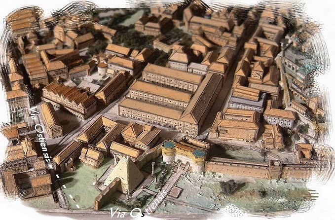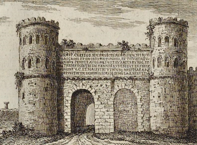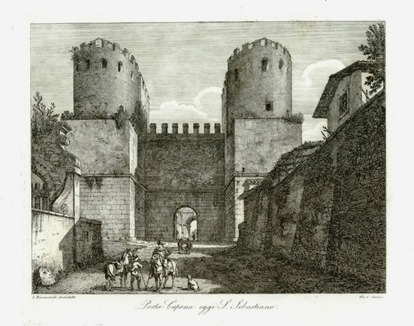 오스티엔시스 가도에 있는 포르타 오스티엔시스. 아벤티노를 향해 가려면 이 문을 통과해야 했다. 두 개의 반원형 탑이 나란히 있는 두 개의 통로로 이루어져 있었다. 왼쪽에는 피라미드 형태의 C. 케스티우스 무덤이 보인다. 포르타 오스티엔시스는 포르타 산 파올로가 되었고 오늘날에도 여전히 존재한다.