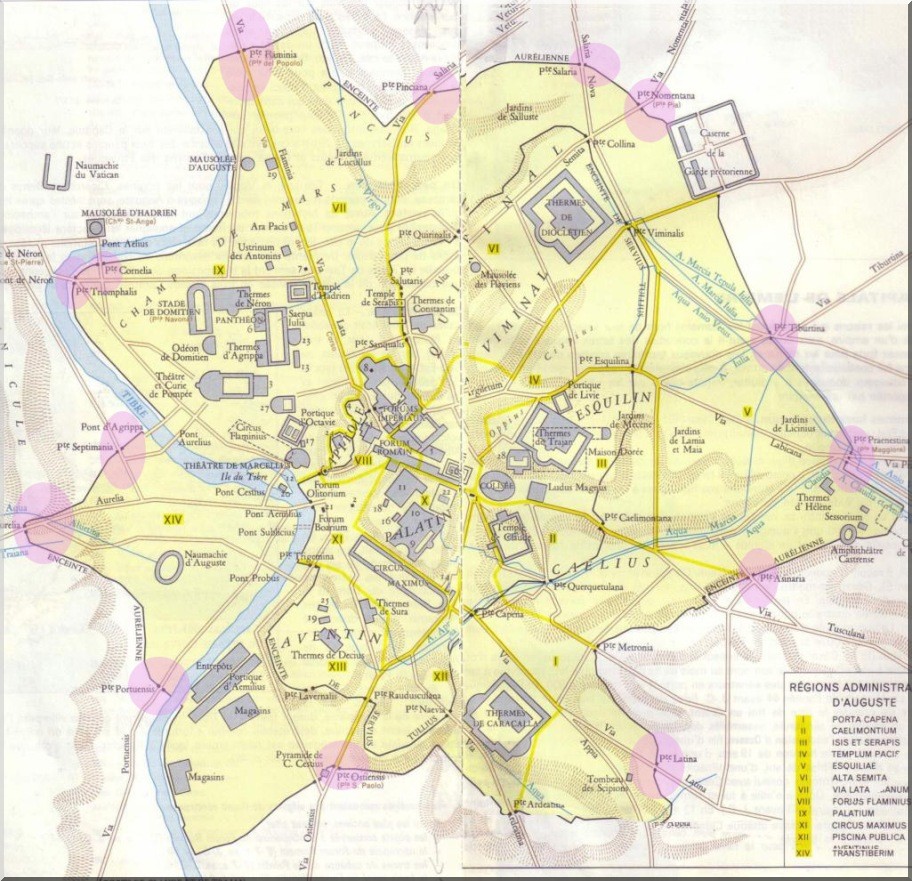 아우렐리아누스 성벽의 범위와 문(분홍색)을 나타낸 지도