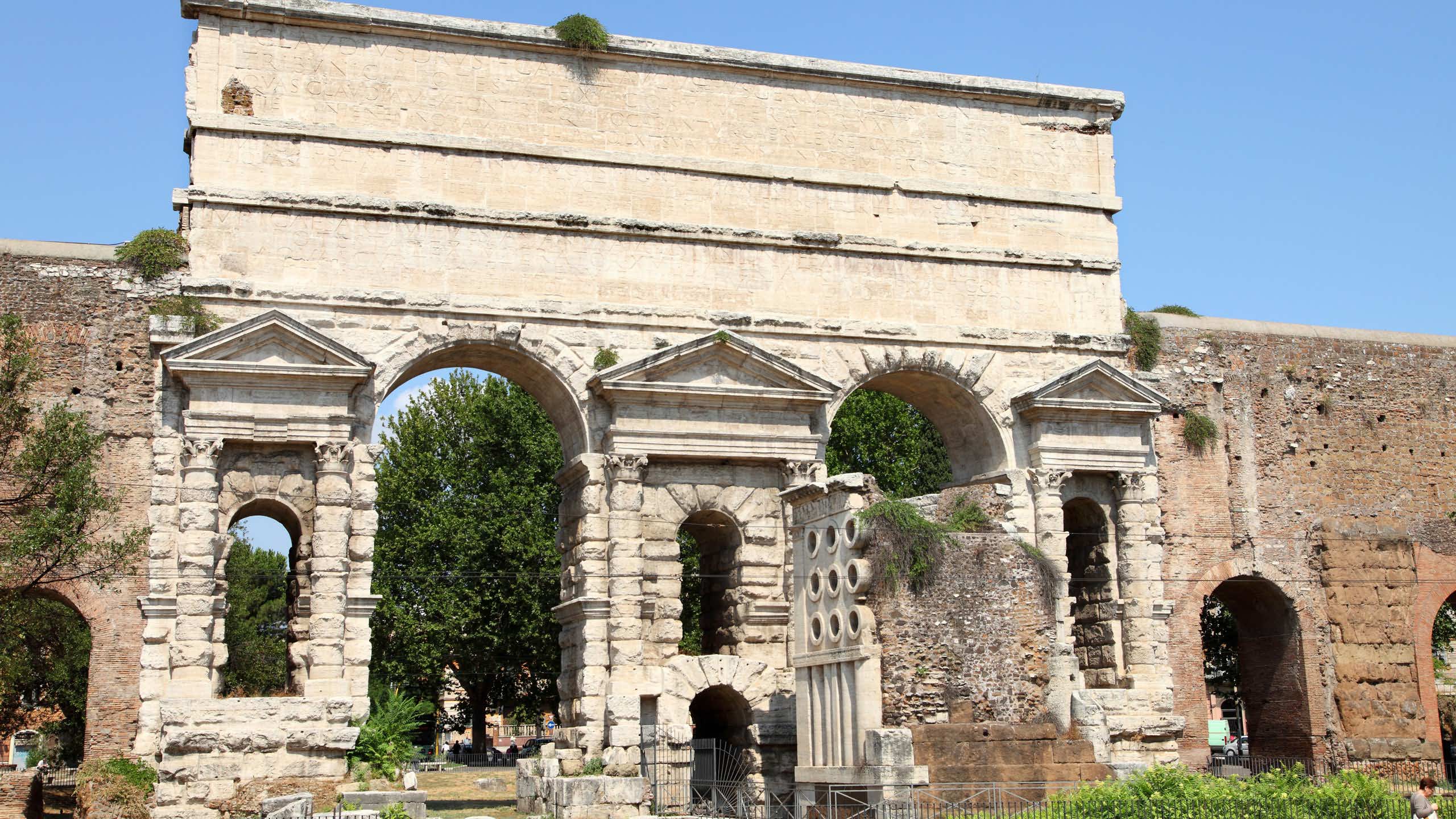 포르타 프라이네스티나, 오늘날 포르타 마조레(정문)는 수도교인 아쿠아 클라우디아(수로 하단)와 아니오 노부스(수로 상단)의 이중 아치 문이었다. 52년에 클라우디우스 황제에 의해 건설된 이 문은 252년 아우렐리아누스 성벽에 통합되었다. 이 문은 오늘날에도 여전히 존재하며, 1838년도 포르타 마조레의 복원 중에 나타난 제빵사 에우리사케스와 그의 아내 아티니아의 공화국 시대 무덤(BC 30)을 볼 수 있다.