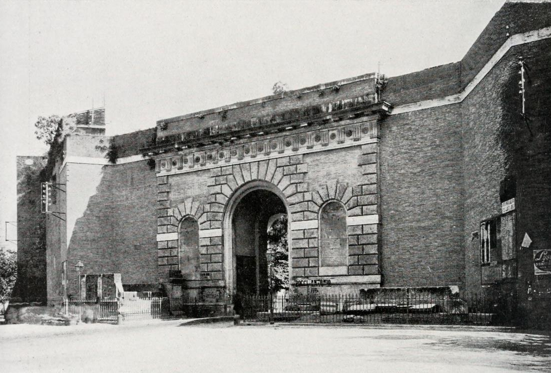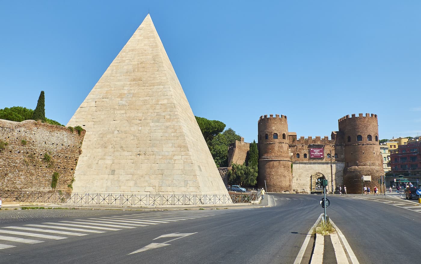 오스티엔시스 가도에 있는 포르타 오스티엔시스. 아벤티노를 향해 가려면 이 문을 통과해야 했다. 두 개의 반원형 탑이 나란히 있는 두 개의 통로로 이루어져 있었다. 왼쪽에는 피라미드 형태의 C. 케스티우스 무덤이 보인다. 포르타 오스티엔시스는 포르타 산 파올로가 되었고 오늘날에도 여전히 존재한다.