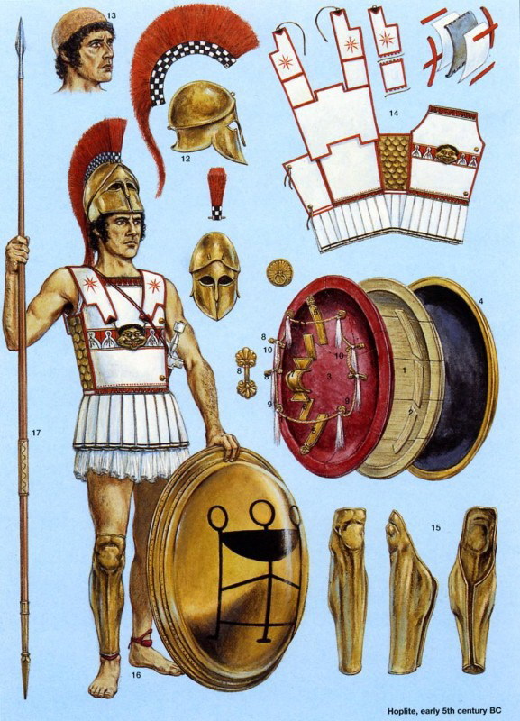 적어도 BC 650년('Chigi 꽃병'의 연대를 통해)까지 거슬러 올라가는 그리스 도시 국가들 간의 전쟁 스타일은 투척 부대의 지원을 받는 호플리테스 팔랑크스를 기반으로 두었다. '호플리테스'는 보통 중산층(아테네에서 제우기테스라고 불리는)으로부터 징집된 보병들로, 그들은 이런 방식의 전투에 필요한 장비를 살 여유가 있었다. 중장갑에는 일반적으로 흉갑이나 린넨 흉갑, 정강이 보호대, 투구, 그리고 크고 둥근 볼록한 방패(아스피스 또는 호플론)가 포함되었다. 호플리테스는 페르시아 창보다 훨씬 긴 긴 창(도리)과 검(크시포스)으로 무장했다. 중장갑과 긴 창은 그들이 백병전에서 우월하게 만들었고 원거리 공격으로부터 상당한 보호를 해주었다. 경무장한 척후병, 프실로이는 또한 분쟁 기간 동안 중요성이 커진 그리스 군대의 일부를 구성했다. 예를 들어 플라타이아이 전투에서 그들은 그리스 군대의 절반 이상을 구성했을 수 있다. 그리스 페르시아 전쟁에서는 그리스 군대의 기병 사용은 보고되지 않는다.