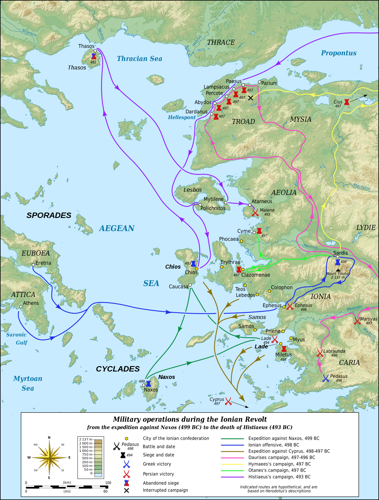 히마이에스는 프로폰티스로 가서 키오스를 점령했다. 다우리소우가 군대를 카리아로 이동시킨 후, 히마이에스는 헬레스폰트를 향해 진군했고, 트로아스의 몇몇 도시뿐만 아니라 많은 아이올리스 도시들을 점령했다. 하지만, 그는 그 후 병에 걸려 사망하면서 그의 캠페인은 끝이 났다. 한편, 오타네스는 아르타페르네스와 함께 이오니아에서 캠페인을 벌였다.