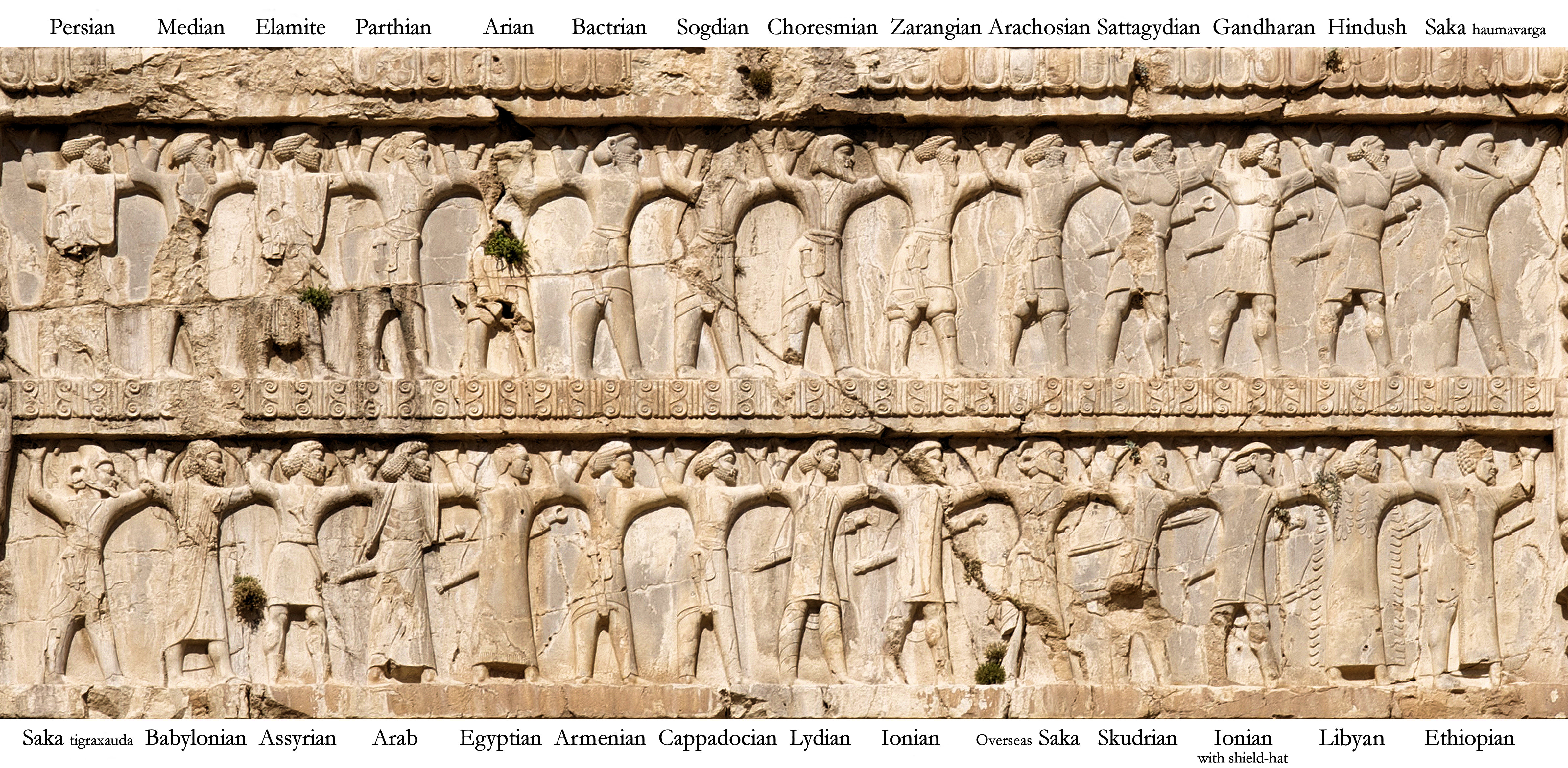 · 1,700,000명 - 메디아인(이란 북부와 서부), 키시아인(페르시아만 부근), 히르카니아인(카스피 해 남동부, 투르크메니스탄), 아시리아인(메소포타미아 상부), 칼데아인(고대 바빌로니아인), 박트리아인(힌두쿠시 산맥 북쪽), 사카족(유라시아 스텝 북부와 동부 및 타림 분지), 인도인(인더스 계곡 지역), 아리아인(아프가니스탄 서부), 파르티아인(이란 북동부), 코라스미아인(호라즘, 중앙아시아 서부), 소그디아인(사마르칸드 주변), 간다라인(파키스탄 북서부와 아프가니스탄 북동부), 다라다인(카슈미르 계곡 북서부), 카스피인(카스피 해 남서부), 드랑기아나인(이란 동부와 아프가니스탄 남서부), 팍티에스인(파시툰, 아프가니스탄), 우티아인, 미키아인(아라비아반도 페르시아만 연안), 파리카니아인(바루치스탄, 파키스탄 남서부), 아라비아인, 아프리카의 에티오피아인, 바루치스탄의 에티오피아인(이란 시스탄오발루체스탄주), 리비아인, 팜플라고니아인, 리기에스인(조지아), 만나이인(이란 북서부), 마리안디노이인(비티니아), 카파도키아인, 프리기아인, 아르메니아인, 리디아인, 미시아인(소아시아 남서부), 아시아 트라키아인, 피시디아인, 밀야스인(소아시아 남서부), 모스코이인(조지아), 타발인(아나톨리아 중남부), 마크로네스인(폰토스 동쪽), 모스노이코이인(아나톨리아 북부 연안), 마레스인(트라브존), 콜키스족(조지아 서부), 알라로디아인(아르메니아 고원), 사스피리아인(쿠르드족), 홍해 섬사람을 포함한 47개 민족 출신으로 구성된 보병.