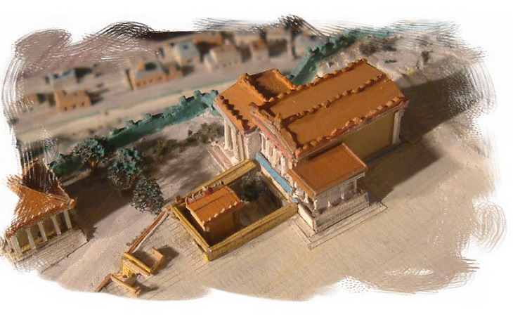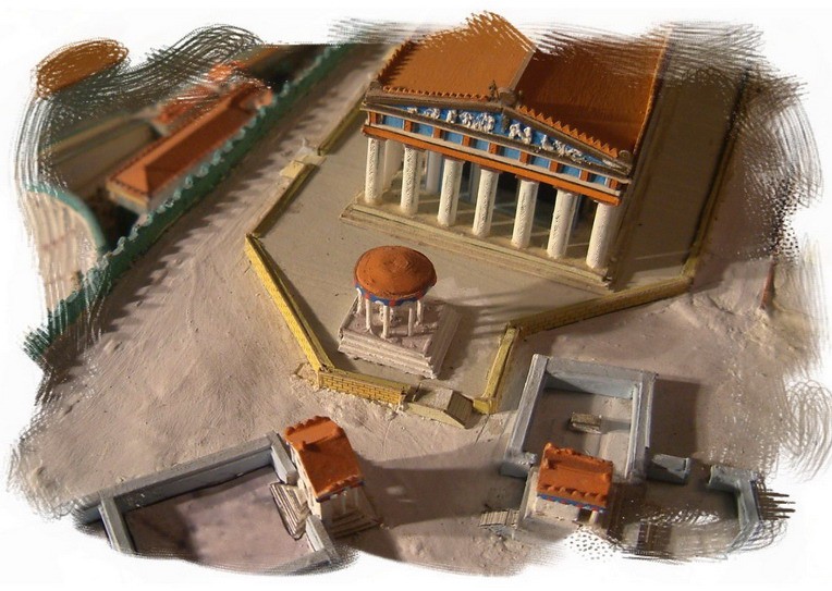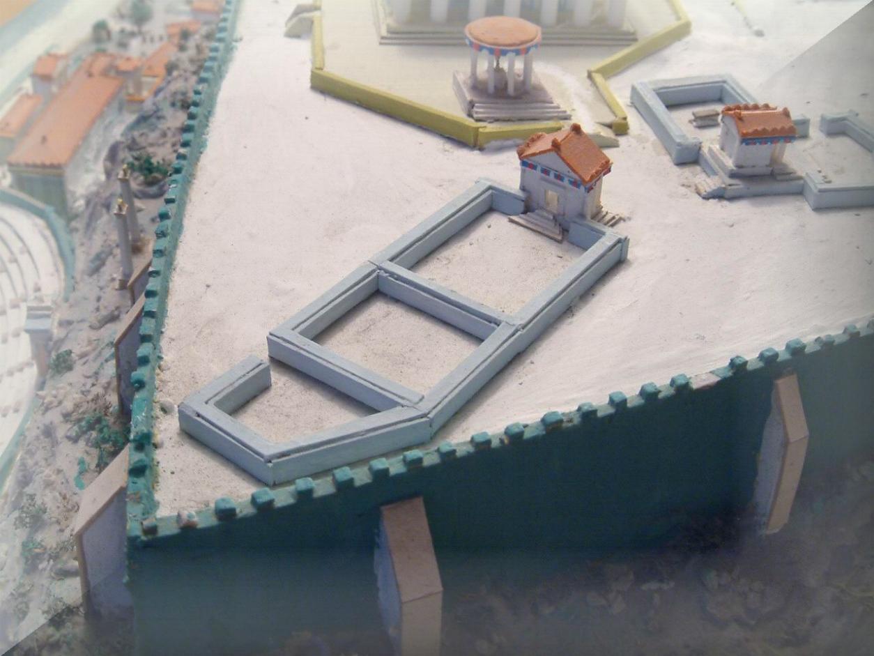 사진의 앞부분에는 여전히 잘 알려지지 않은 건물들(4)이 있다. 사진 중앙에 있는 작은 신전은 제우스 폴리에오스 성소가 될 수 있는 "부콜레이온"일 수 있다. 오늘날, 사람들은 기초를 결정하기 위한 땅 속의 홈들만을 볼 수 있다. 이 위치에 대한 정보는 고고학적인 자료라기보다는 문학적인 자료에서 나온 것이다. 왼쪽에 판디온 성소를 볼 수 있다.