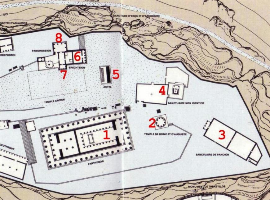 에레크테이온은 아테네의 모든 신전 중에서 가장 신성한 신전이다. 진짜 이름은 아테나 폴리아스 신전이었다. 건물 전체가 지면의 불규칙성으로 인해 복잡한 건축물을 보여준다. 신전은 다른 층에 세워진 두 개의 성소로 나뉘어 있는 직사각형 신상 안치소로 구성되어 있으며, 세 개의 불균등한 주랑 현관이 측면에 있다. 전경에는 4개의 이오니아식 기둥으로 이루어진 높은 북쪽 주랑 현관(8)이 있으며 아티카 예술의 걸작 중 하나였다. 가운데는 더 길고 높이가 3 미터인 신전 부분이 있다(6). 에레크테오스의 성소이며, 북쪽 주랑 현관을 통해 접근할 수 있었다.