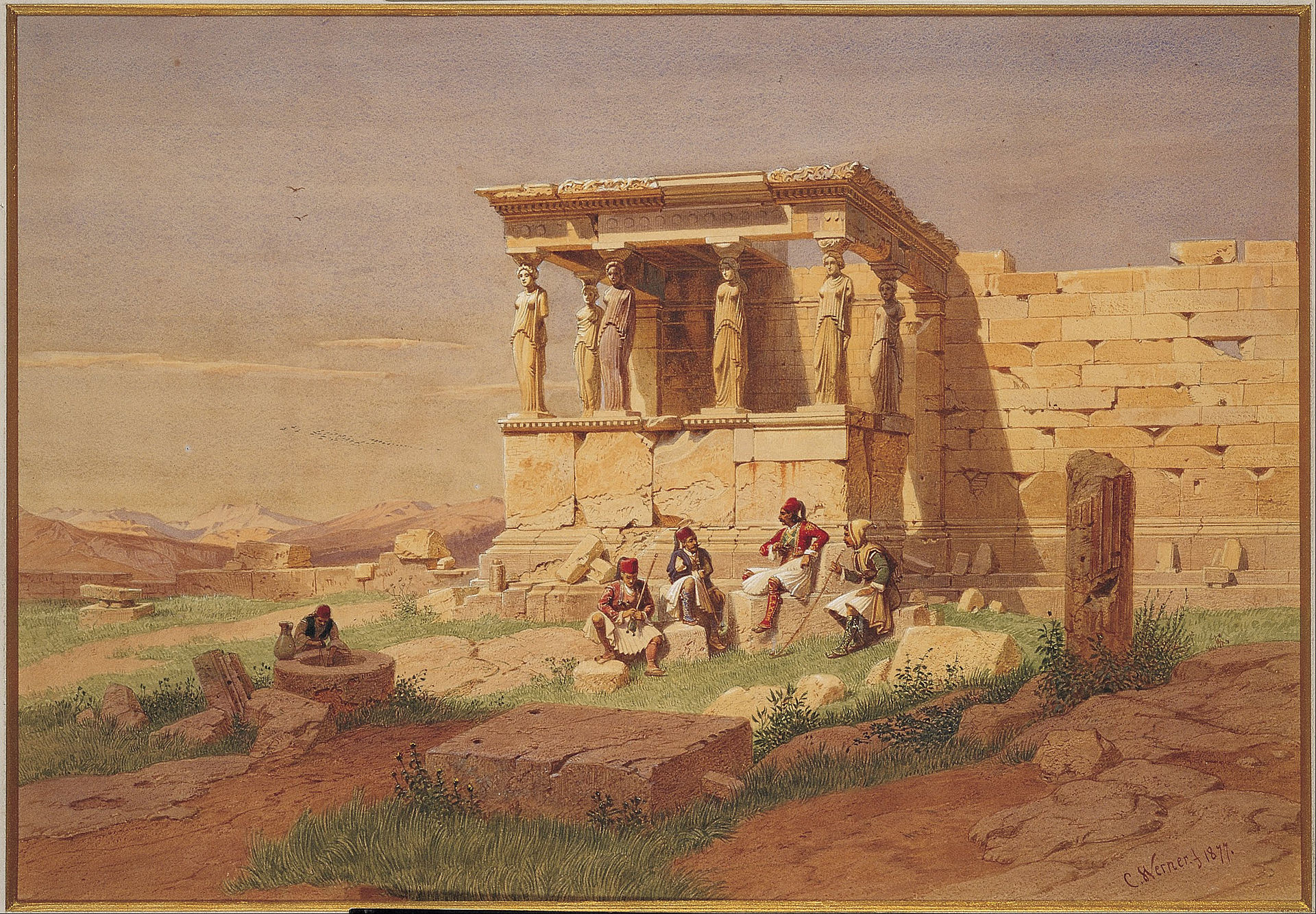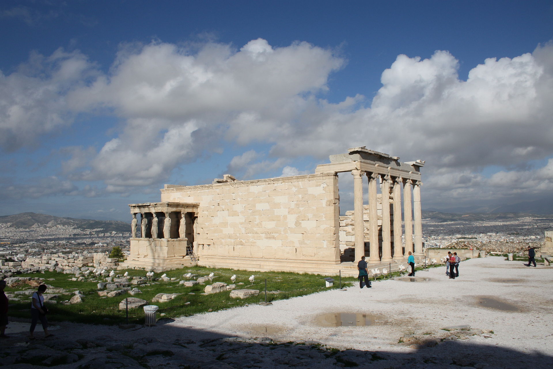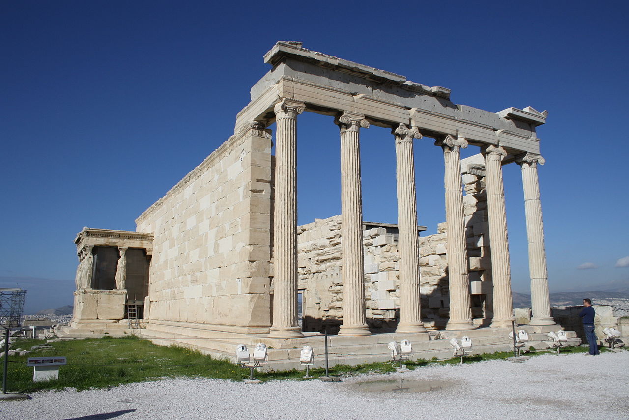 이 사진에 나타난 에레크테이온은 아테나 폴리아스의 신상 안치소의 파사드를 나타내며, 그 앞에는 도리스식 기둥으로 된 주랑 현관이 있다. 이 파사드 옆에, 전경의 움푹 들어간 곳을 볼 수 있다. 이곳에 아테나 폴리아스 제단이 위치한 작은 신전이 있다. 그곳에서 아테나가 창을 들어 올리자 신성한 올리브가 자라났다.