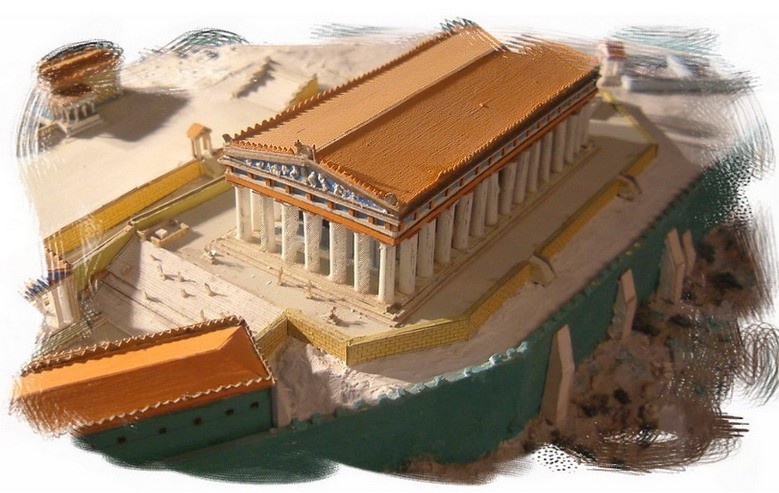 파르테논 신전의 유적은 웅장한 크기뿐만 아니라 건물의 아름다움과 명성을 통해서도 아크로폴리스의 전체 단지를 지배하고 있다(1). 파르테논 신전의 건축은 페리클레스가 피디아스에게 책임을 맡겼다. 외관상 파르테논 신전은 도리스식 신전이다. 신전은 3층의 대리석 바닥에 놓여 있다. 각각의 세부 사항이 효과를 내기 위해 계산된 완벽한 구조이다.