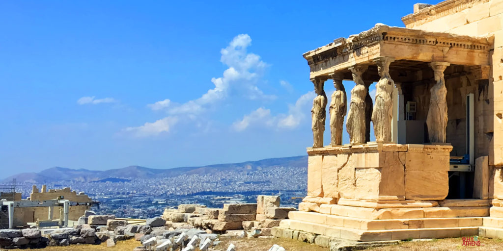 마지막으로 여인상 기둥들(7)로 된 남쪽 주랑 현관 또는 주랑 현관은 일종의 회랑 또는 로지아일 수 있다. 그곳에서 이오니아풍 긴 드레스를 입은 젊은 여성을 나타낸 6개의 유명한 조각상이 기둥으로 서 있는 것을 볼 수 있다. 여인상 기둥은 파사드에 4개, 양쪽에 하나씩 있다.