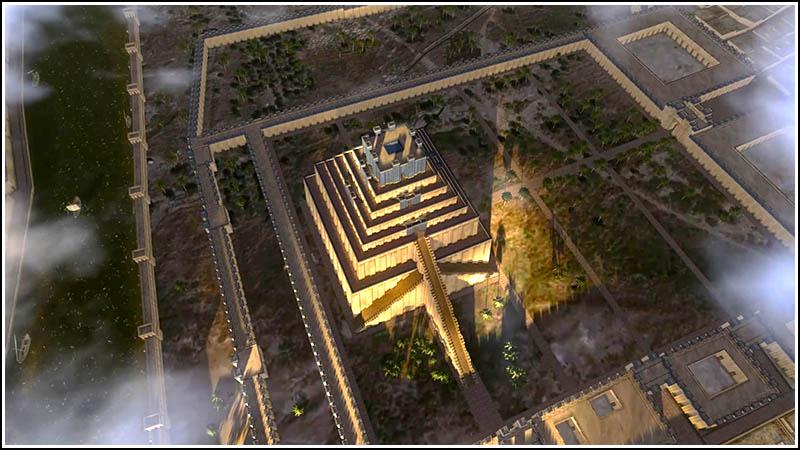 더 멀리서 바라본 지구라트와 신성한 지역. 성벽으로 만들어진 거대한 방어 구조물이 눈에 띈다. 신성한 문은 사진의 위에 있는 두 개의 에워싸인 안뜰 사이에 위치해 있었다. 메소포타미아의 거대한 지구라트는 바벨탑과 연관된 전설로 남아 있다.