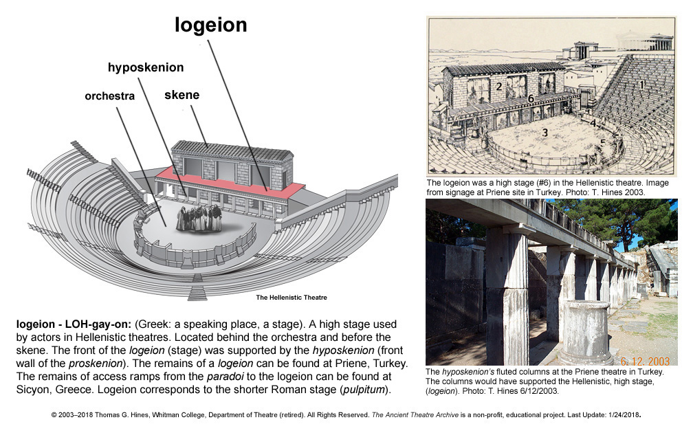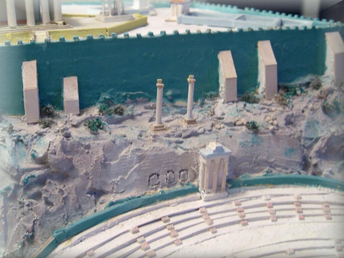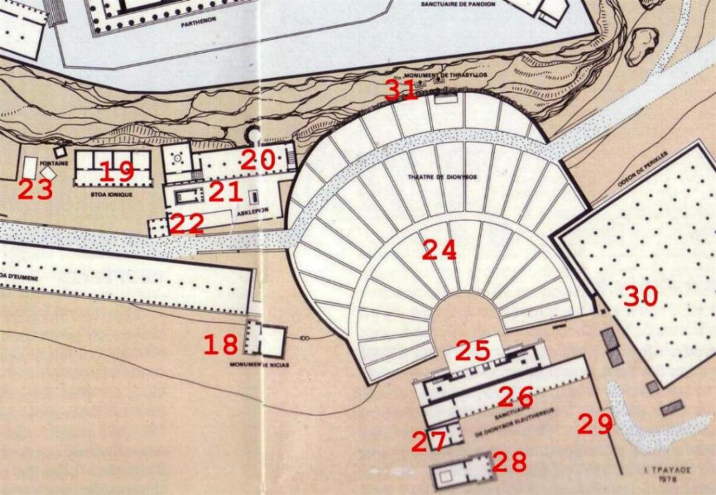 디오니소스 극장의 꼭대기에 있는 두 개의 기둥(31)은 로마 시대의 코리고스(합창자) 기념물이다. 객석의 가장자리에 있는 기념비는 1826년에 재건된 트라실로스의 코리고스 기념물(BC 320년) 일 수도 있다.